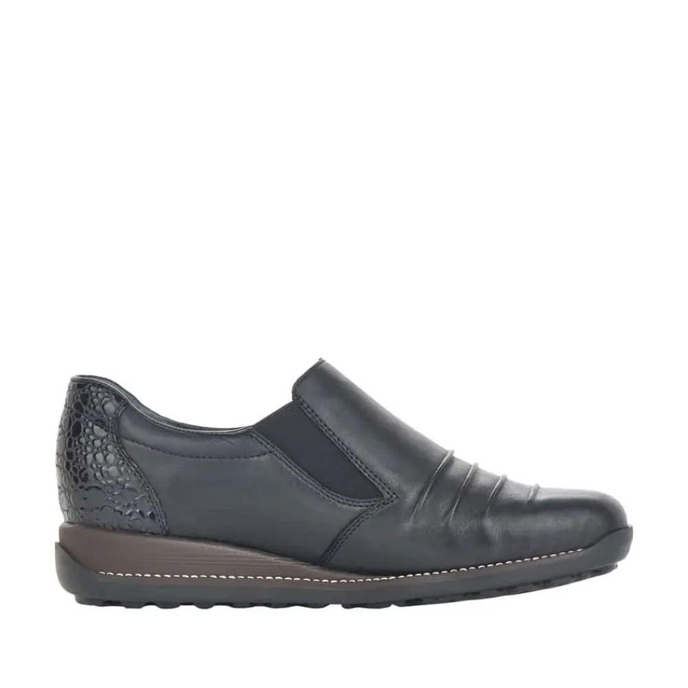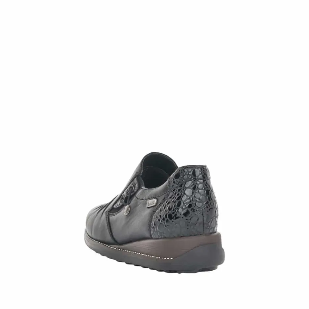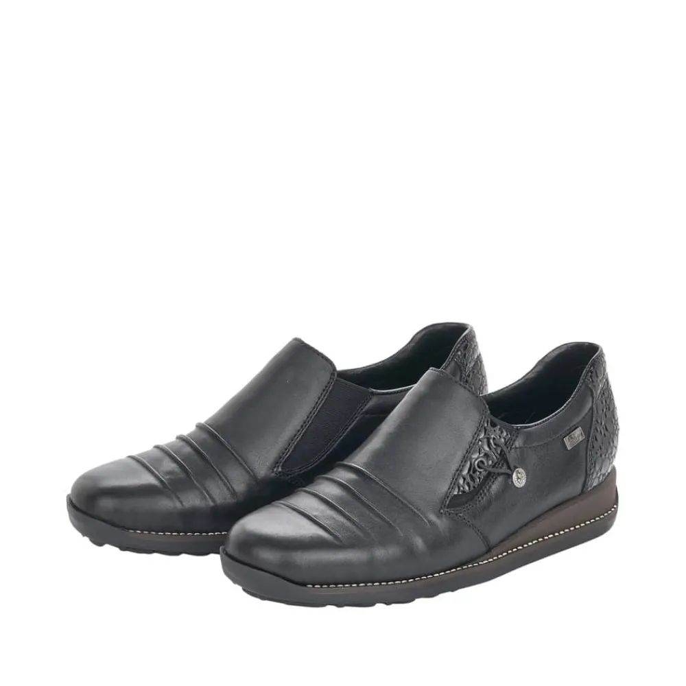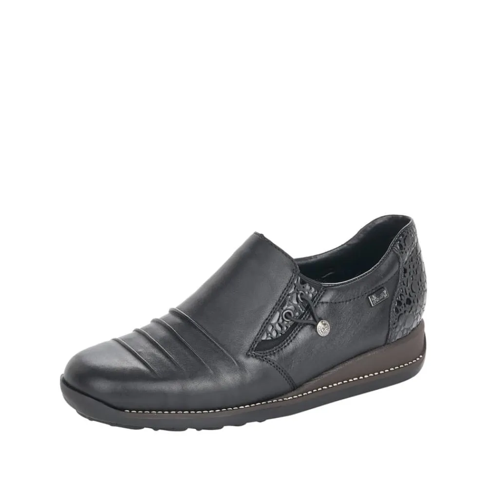 Rieker sko til dame i sort. Stilfuld Rieker sko til dame. Denne sko er udstyret med RiekerTex for vandafvisning. Skoen har en overdel i ægte læder, en stødabsorberende sål og er let og fleksibel. De elegante lakdetaljer på hælen skaber et stilfyldt design med flotte detaljer. Den praktiske elastikåbning gør det nemt at tage skoen af og på.