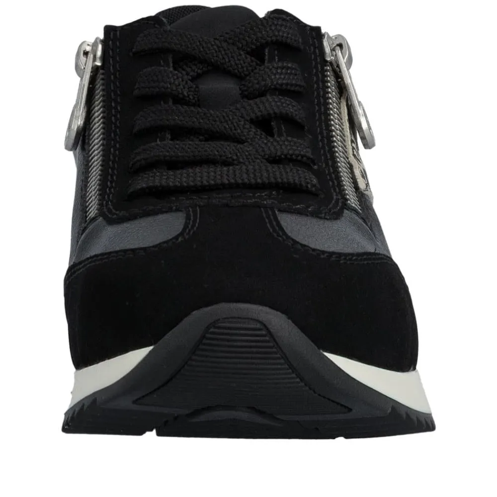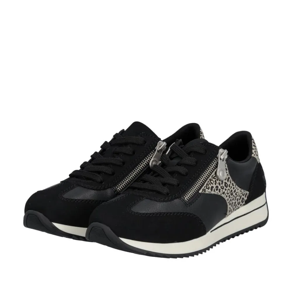Rieker sneakers til dame i sort. Stilfulde sneakers med skindoverdel og moderne leoparddetaljer, der giver et feminint udtryk og et flot look. Snørebåndene sammen med de to funktionelle lynlåse gør skoen nem at justere, så den sidder behageligt på foden. Indvendigt har skoen en blød udtagelig sål og ekstra bredde (H), som sikrer god komfort dagen igennem og giver god plads til foden. Den mønstrede ydersål giver øget stødabsorbering og skridsikkerhed, så du får en stabil gang.