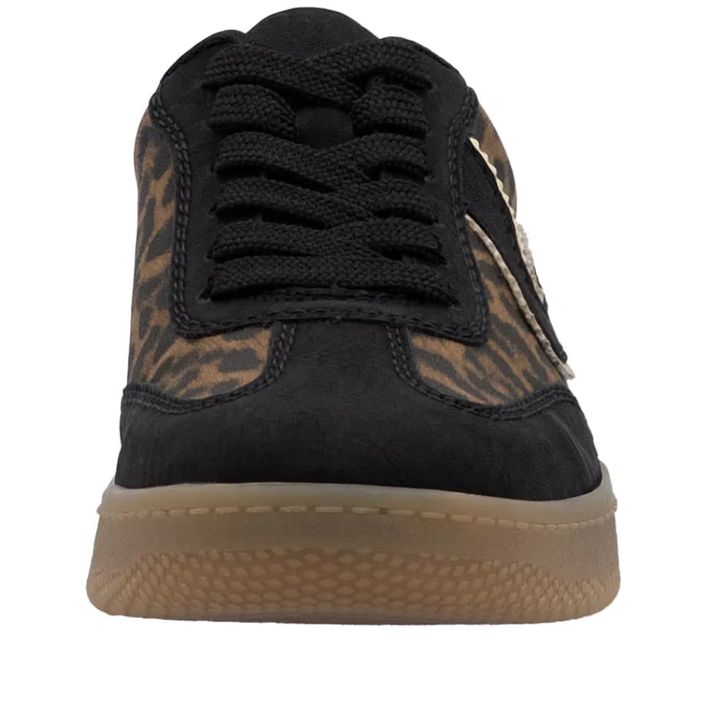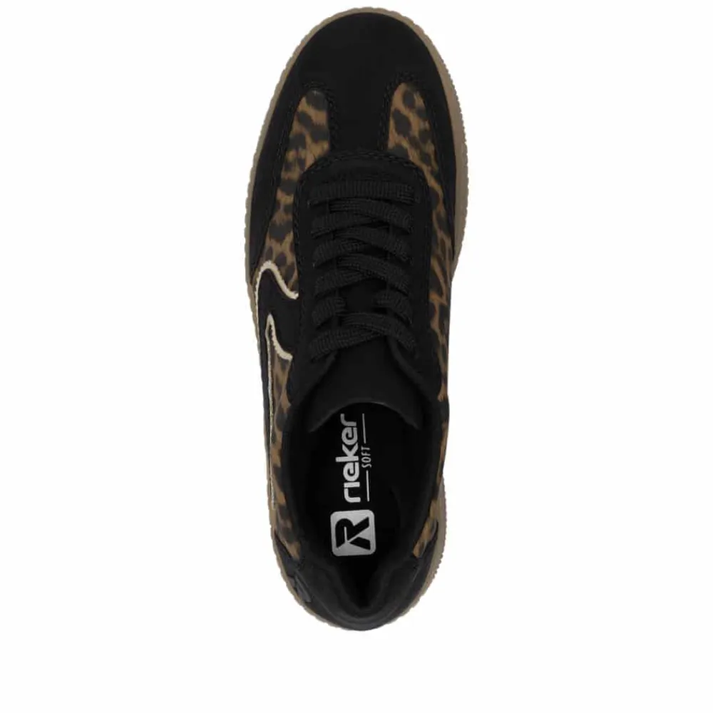 Rieker sneakers til dame i leopard. Trendy sneakers med leopardmønster og stilfulde sorte detaljer, der skaber et moderne look. Skoen har snørebånd, så du nemt kan justere pasformen til din fod. Indvendigt sikrer den bløde Rieker Soft indersål maksimal komfort, og den kan tages ud efter behov. Den lette og fleksible konstruktion kombineret med en stødabsorberende sål giver en behagelig oplevelse hele dagen.
