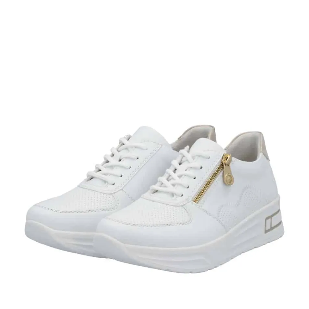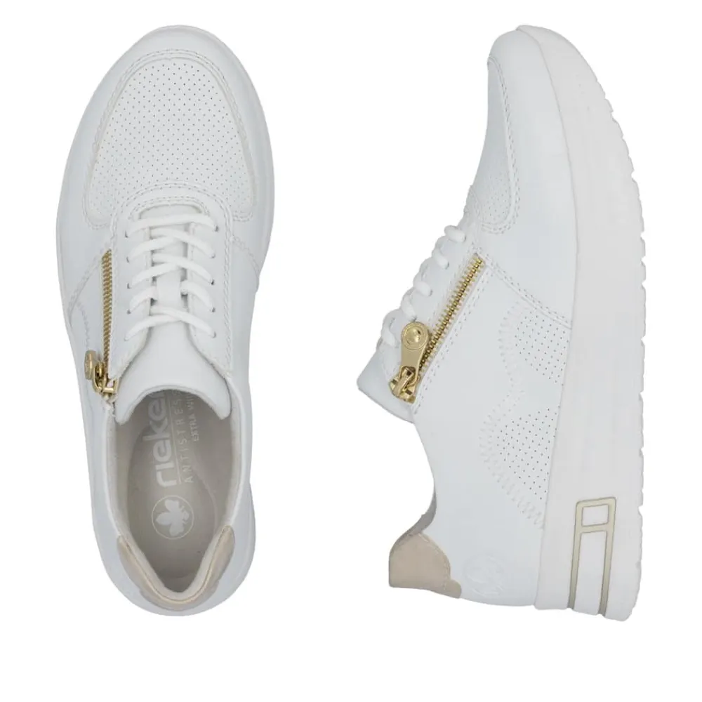 Rieker sneakers til dame i hvid. Træd ind i stil og komfort med denne elegante sneakers, der kombinerer en lav kilehæl for et subtilt løft og et flatterende udtryk – ideel til heldagsbrug. Kombinationen af snørebånd og lynlås sikrer en skræddersyet pasform og gør skoen nem at tage af og på. Den udtagelige Rieker Antistress-indlægssål former sig efter fodens kontur og giver fremragende stødabsorbering ved hvert skridt, mens den brede pasform i vidde H sikrer ekstra plads og komfort. Den moderne hvide overdel med smukke gulddetaljer tilføjer et stilfuldt præg til dit look. Skoen er fremstillet af slidstærkt syntetisk materiale med en åndbar tekstilforing, der holder fødderne friske hele dagen. Den lette og robuste syntetiske sål gør denne sneakers til det perfekte valg til både hverdagsbrug og aktive dage.