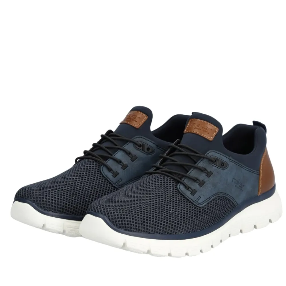 Rieker sneakers til herre i blå. Denne moderne sneakers kombinerer stilfuldt design med høj komfort og praktiske detaljer. Den er udstyret med elastikbånd og et elastisk skaft, som gør den nem at tage af og på. Den bløde, stødabsorberende ydersål har et mønstret design, der øger skridsikkerheden og giver stabilitet – selv på ujævnt terræn. Med ekstra vidde G 1/2 får du en rummelig pasform, der sikrer komfort hele dagen.