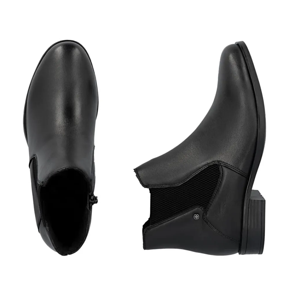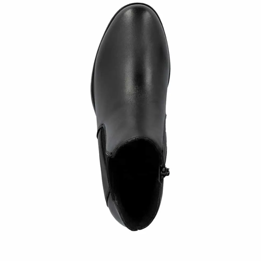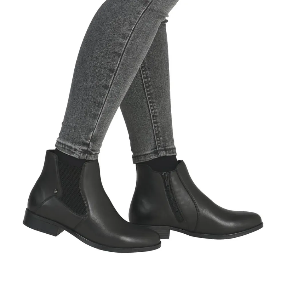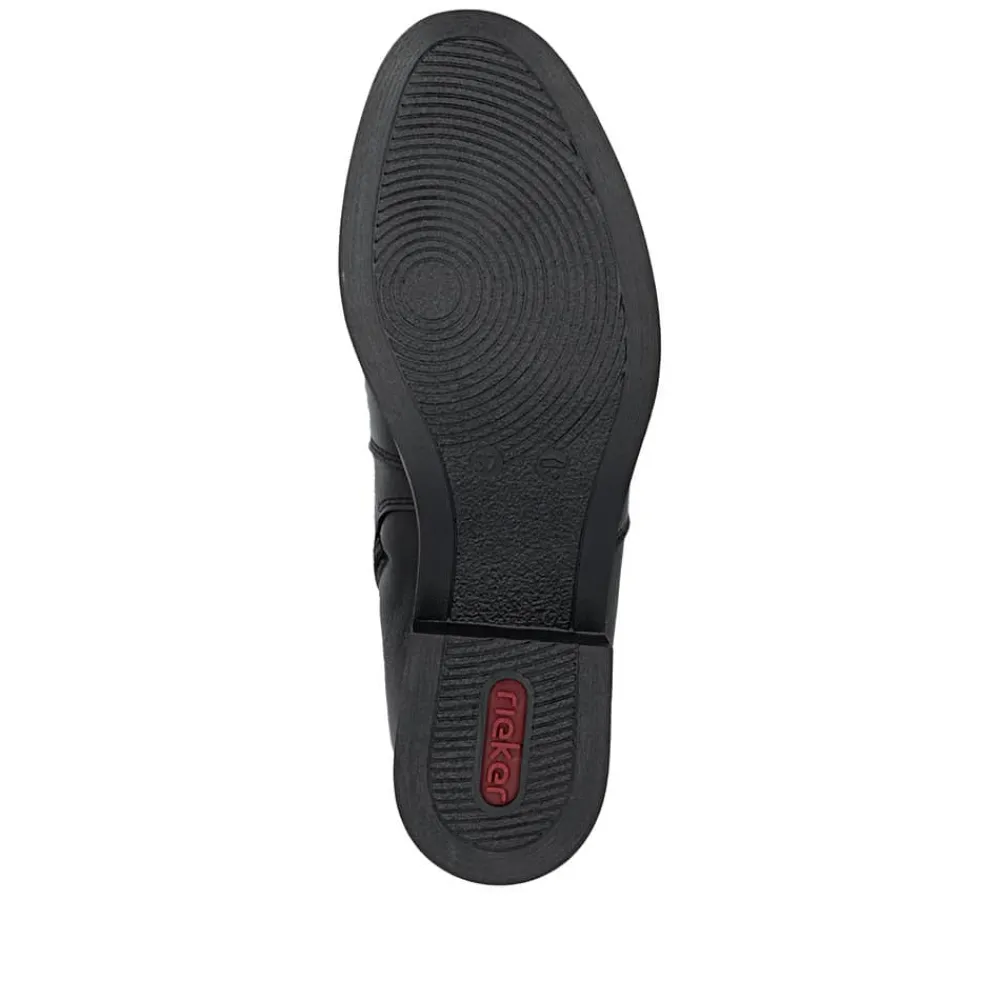 Rieker støvle til dame i sort. Moderne støvle i sort med et klassisk design og en overdel i blødt skind, der giver et stilfuldt look. Støvlen har en funktionel lynlås på indersiden og elastik på ydersiden, hvilket gør den nem at tage af og på og sikrer en behagelig pasform. Indvendigt finder du en let foring og en blød, udtagelig indersål, som giver god komfort. Den lille hæl på 3 cm tilføjer et diskret løft uden at gå på kompromis med komforten. Ydersålen er stødabsorberende og mønstret for at give øget støtte og stabilitet.