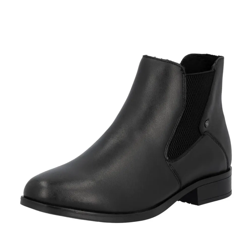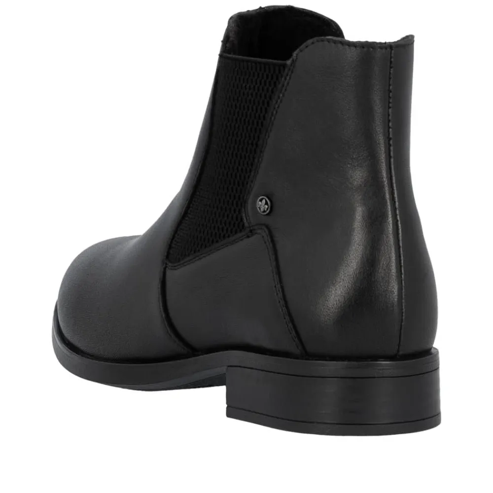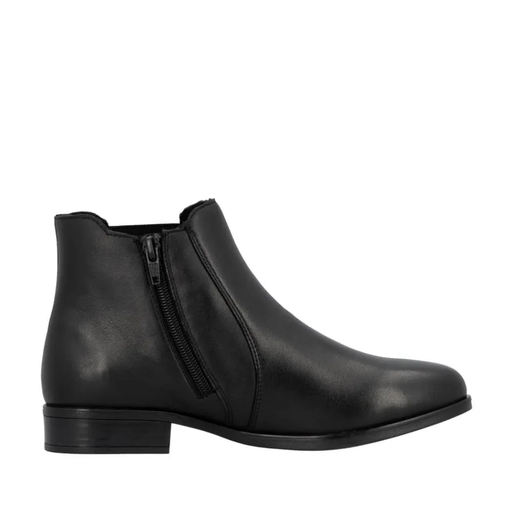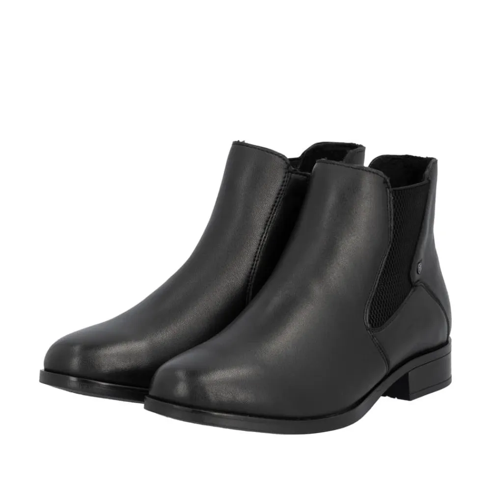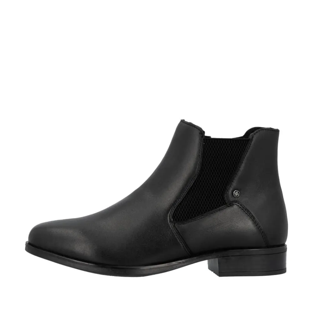 Rieker støvle til dame i sort. Moderne støvle i sort med et klassisk design og en overdel i blødt skind, der giver et stilfuldt look. Støvlen har en funktionel lynlås på indersiden og elastik på ydersiden, hvilket gør den nem at tage af og på og sikrer en behagelig pasform. Indvendigt finder du en let foring og en blød, udtagelig indersål, som giver god komfort. Den lille hæl på 3 cm tilføjer et diskret løft uden at gå på kompromis med komforten. Ydersålen er stødabsorberende og mønstret for at give øget støtte og stabilitet.