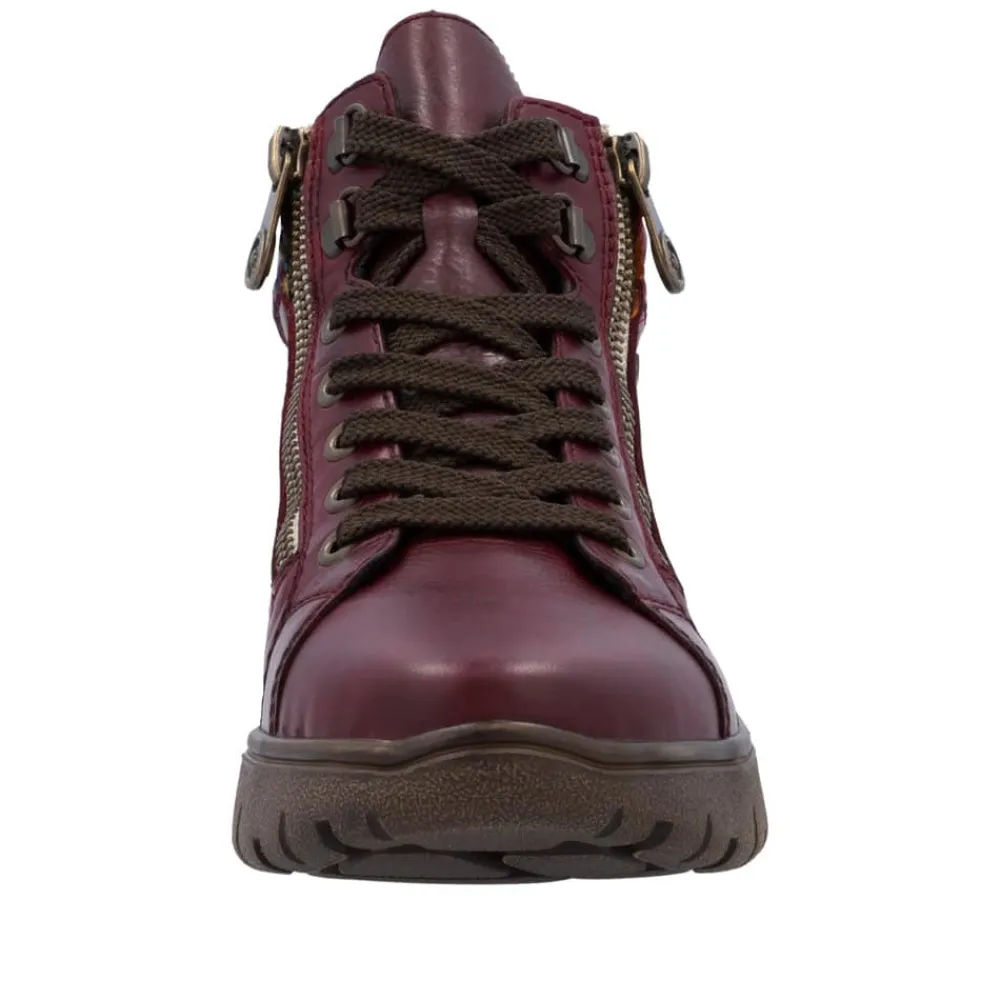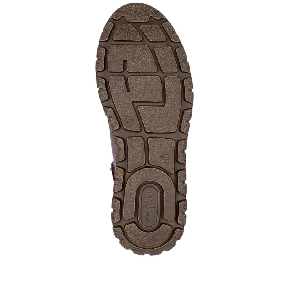 Rieker støvle til dame i bordeaux. Denne støvle kombinerer flot design med praktiske detaljer. Støvlen er udstyret med snørebånd og to funktionelle lynlåse, så du nemt kan tilpasse pasformen til din fod. Indvendigt sørger en varm foring og en blød udtagelig sål for høj komfort, mens ekstra bredde (H) giver mere plads og fleksibilitet til foden. Rieker-Tex gør støvlen kraftig vandafvisende, og den mønstrede ydersål giver både øget stødabsorbering og skridsikkerhed.