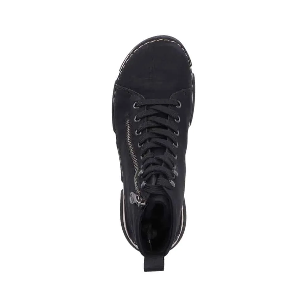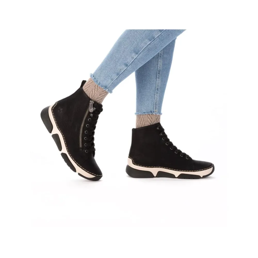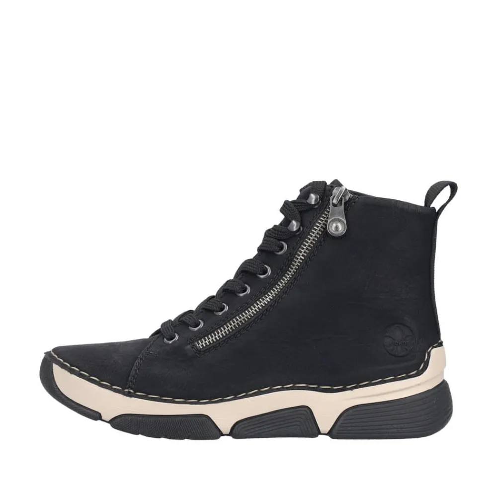 Rieker støvle til dame i sort. Denne støvle er ideel til hverdagen. Den er udstyret med både snørebånd og en funktionel lynlås, som gør det nemt at tage den af og på. Indvendigt finder du en let foring og en blød sål, der giver god komfort hele dagen. Med Rieker Antistress føles støvlen let og fleksibel, mens den mønstrede ydersål giver øget stødabsorbering og skridsikkerhed.