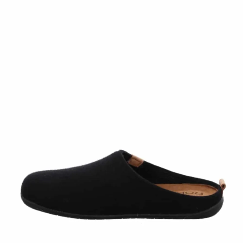 Rohde Greenys N°35 hjemmesko i sort til herre. Denne Rohde Greenys N°35 herre hjemmesko i sort er det perfekte valg for dig, der ønsker både komfort og bæredygtighed. Med en delvist genanvendt gummisål og en blød, udskiftelig læder indersål, vil dine fødder nyde maksimal komfort ved hvert skridt. Det bæredygtige filt materiale, som består af 50% genanvendt uld, gør denne hjemmesko til et ansvarligt valg, du kan have glæde af i lang tid. Den lette og lydløse sål med skridsikker gummibund giver sikkerhed og komfort i hverdagen.