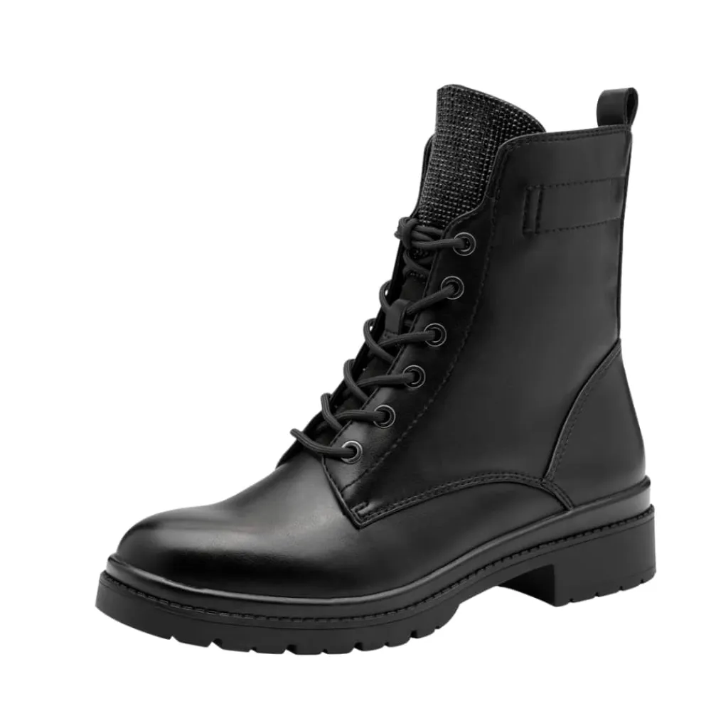 Tamaris støvle til dame i sort. Flot støvle med elegante detaljer som nitter, der giver et moderne look. Modellen har både snørebånd og lynlås, så du nemt kan justere pasformen. Indvendigt finder du en blød udtagelig Touch-sål og en let foring, som sikrer komfort hele dagen. Mens den mønstrede ydersål giver øget skridsikkerhed.