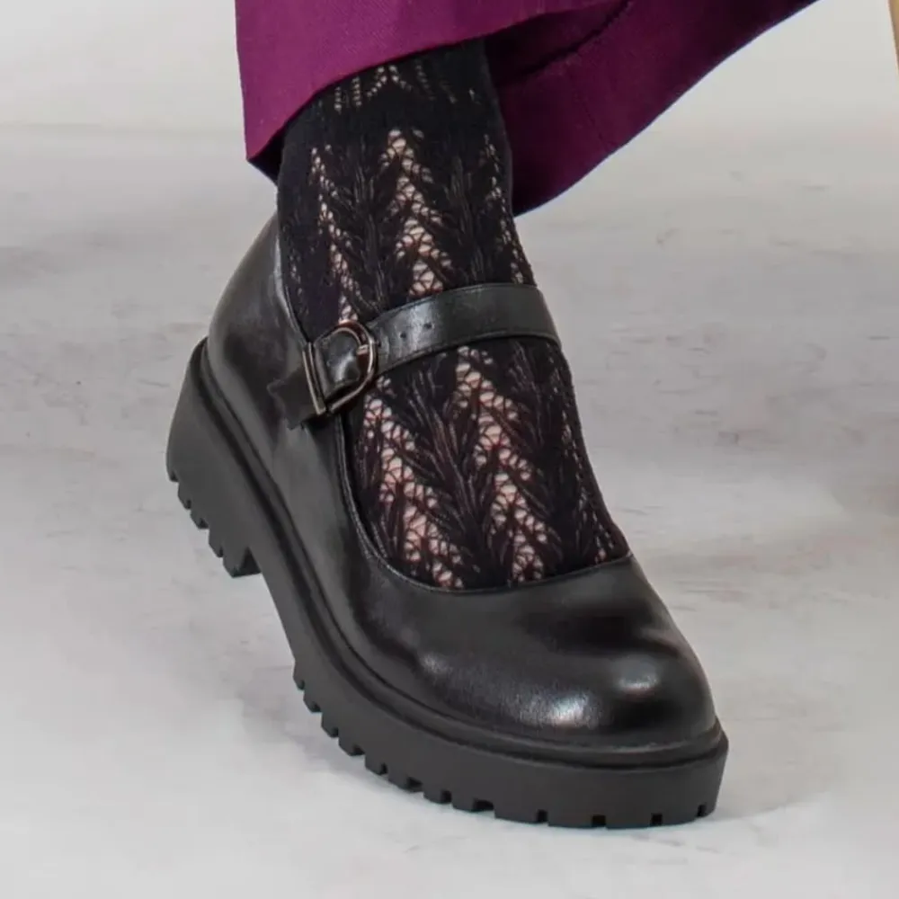 Duffy Lattarico Tre Mary Jane sko til dame i sort. Moderne sort sko med et flot og tidløst design, der passer til mange anledninger. Over vristen har skoen en justerbar rem med spænde, så pasformen nemt kan tilpasses foden. Indvendigt mødes du af en blød indersål, som giver behagelig komfort hele dagen. Ydersålen har et mønster, og den 4 cm høje blokhæl giver et elegant løft uden at gå på kompromis med komforten.