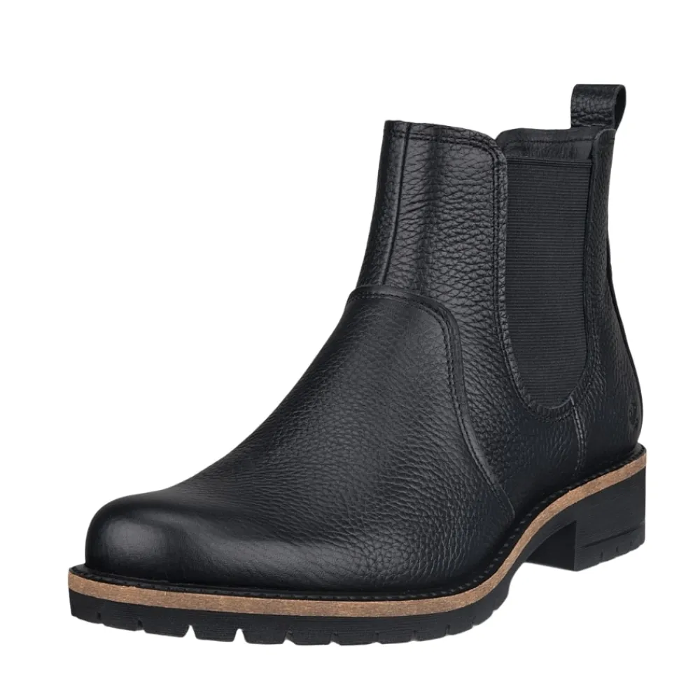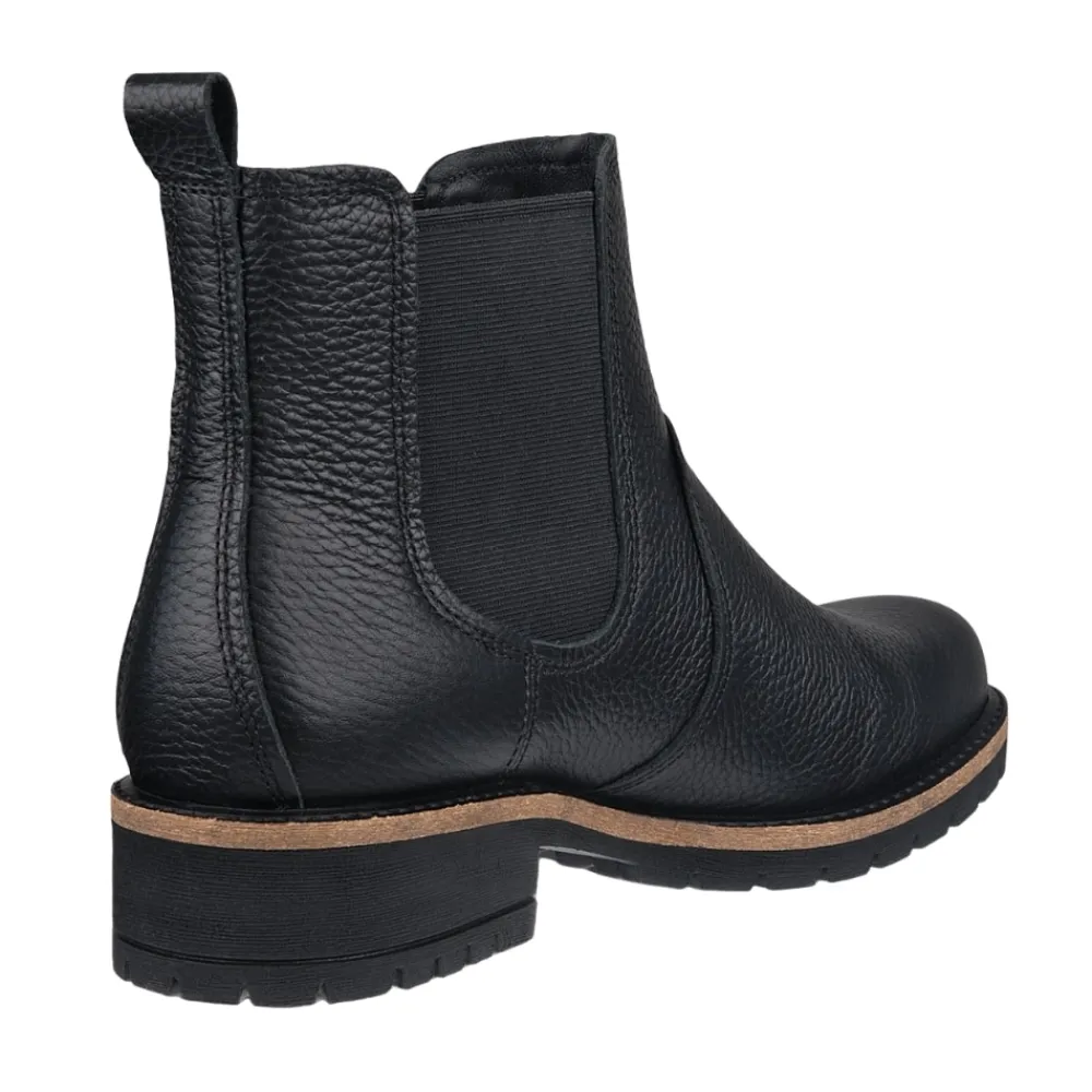 Ecco Elaina støvle til dame i sort. Elegant sort chelseastøvle i læder, der kombinerer tidløst design med moderne komfort. Støvlen har elastikker i siderne, som gør den nem at tage på og giver en fleksibel pasform. Indvendigt er den udstyret med en blød, udtagelig indersål for behagelig støtte, mens Ecco Fluidform™ teknologien giver naturlig bevægelse og blød komfort. Den solide ydersål med blokhæl på ca. 4 cm og mønster sikrer stabilitet og skridsikkerhed hele dagen.