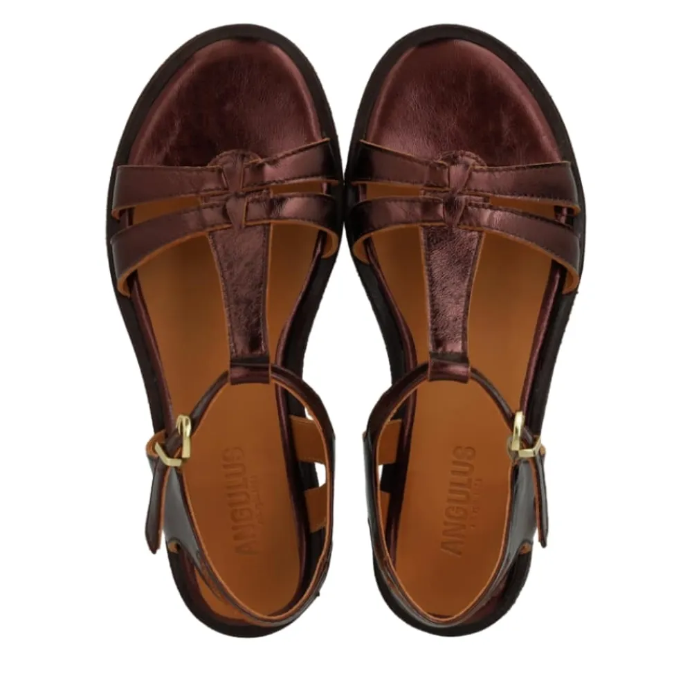 Angulus sandal til dame i metallisk brun. Denne elegante damesandal med smalle stropper og justerbar ankelrem er et stilfuldt valg til enhver garderobe. Det enkle og moderne design gør den nem at kombinere med forskellige outfits. Overdelen er lavet af blødt, førsteklasses læder, som giver en behagelig pasform. De justerbare remme sikrer optimal støtte, så du kan gå komfortabelt hele dagen. Med sin tidløse stil, robuste rågummisål og en flad hæl på 1,5 cm er sandalen ideel til både hverdag og festlige lejligheder.
