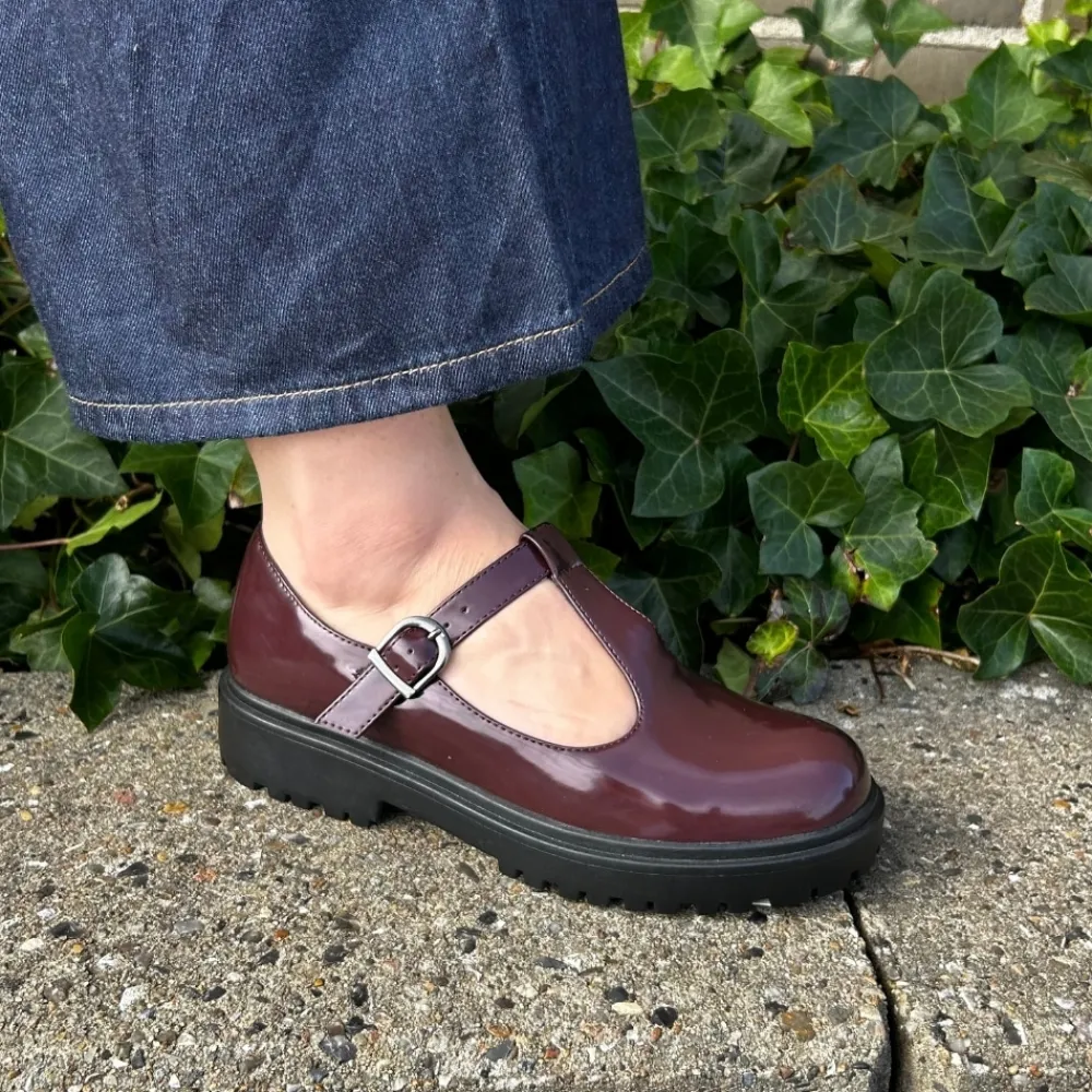 Duffy Lattarico Cinque Mary Jane sko til dame i bordeaux lak. Flot sko i bordeaux med en blank lakoverdel, der skaber et elegant og klassisk udtryk. Over vristen finder du en rem med spænde, der let kan justeres, så skoen sidder perfekt. Den bløde sål indvendigt giver en behagelig komfort, mens ydersålen med mønster og en højde på ca. 4 cm giver et smukt løft og gør skoen komfortabel at bruge dagen igennem