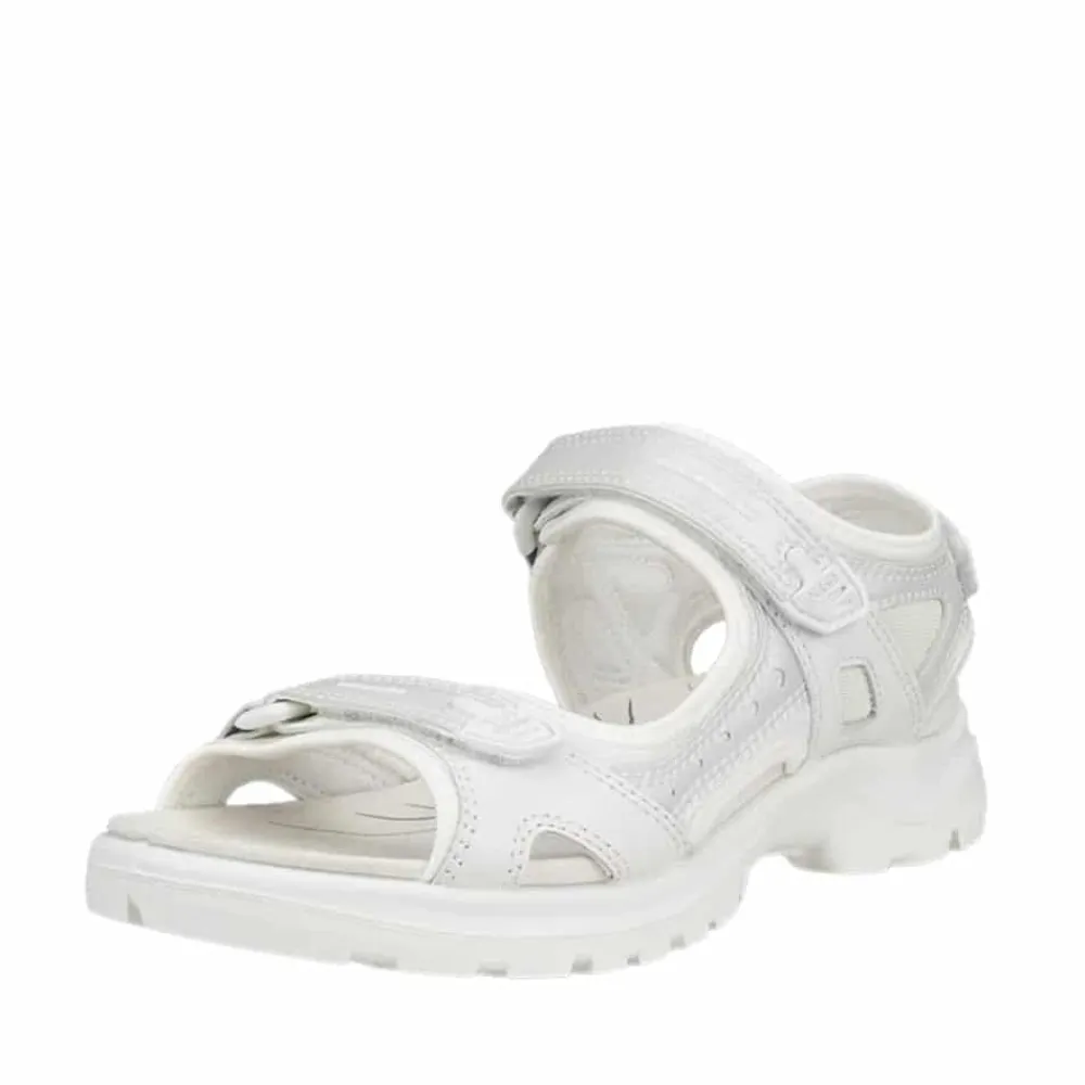 Ecco Offroad sandal til dame i hvid. Tag komforten med dig på lange gåture med denne lette og fleksible sandal. Designet til at give optimal støtte til dine fødder og har en imponerende støddæmpende effekt. Justér pasformen efter dine præferencer med de 3 praktiske velcroremme, der sikrer en perfekt indstilling. Sålen er ikke kun let og fleksibel, men den er også stødabsorberende takket være Ecco Recepter Teknologi. Den innovative DIP mellem sål tilbyder fremragende affjedring hele dagen, hvilket reducerer risikoen for ubehag i fødderne. Uanset terræn bevæger du dig i, vil den fleksible gummiydersål på vores Ecco Offroad Sandal sikre, at du står stabilt.