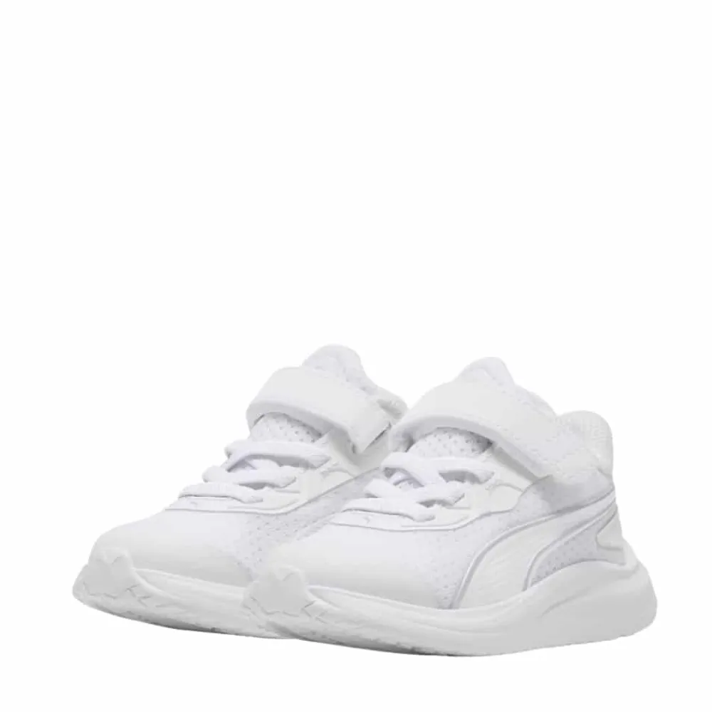Puma Skyrocket 2 AC Sneakers til små børn i hvid. Smart sneakers i en flot hvid farve med Puma detaljer, som giver et pænt og sporty udtryk. Skoen har en velcrorem foran, der gør det nemt at tage skoen af og på, mens elastikken hjælper med at give en god pasform. Indvendigt er skoen udstyret med en blød og udtagelig SoftFoam+ indersål, som giver god komfort til små fødder hele dagen. Ydersålen i gummi er let og har et mønster, der giver øget skridsikkerhed ved leg og bevægelse.