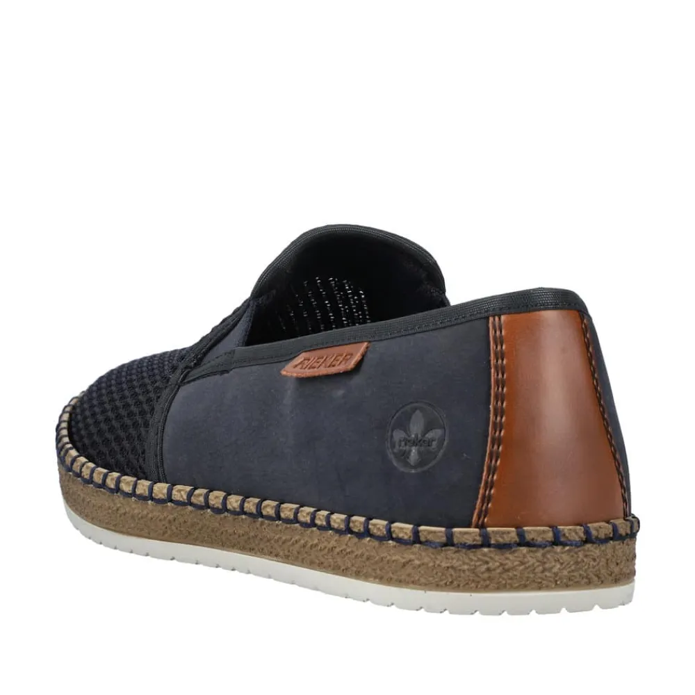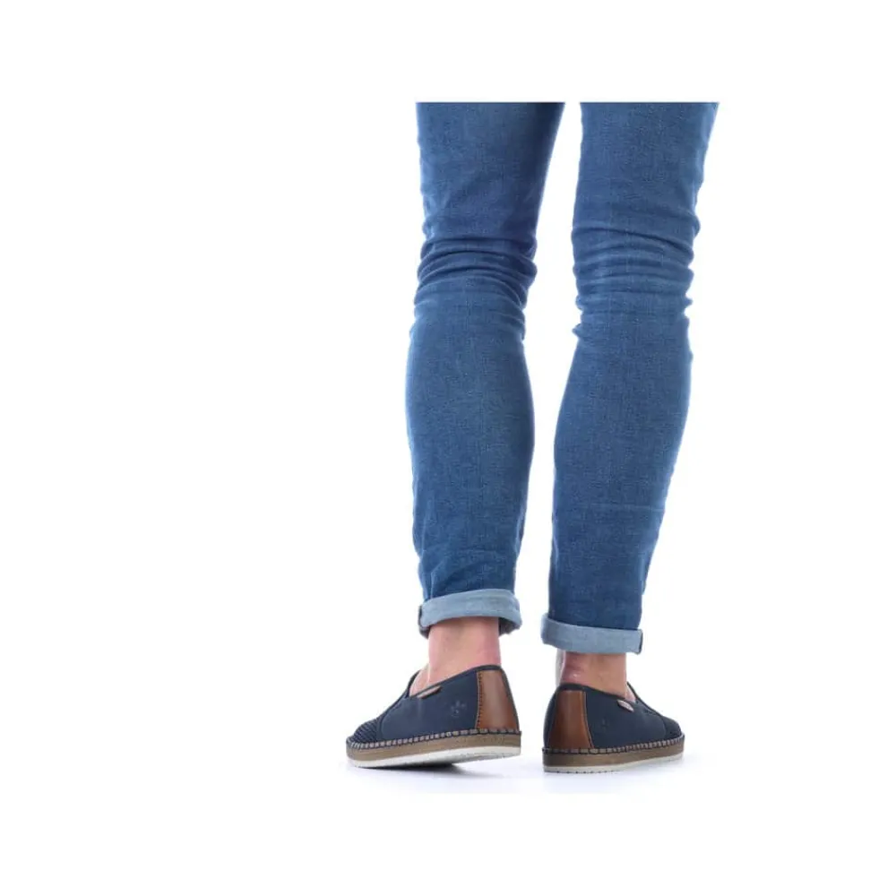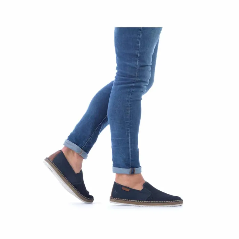 Rieker hyttesko til herre i blå. Glid ubesværet ind i denne hyttesko fra Rieker, udstyret med en indlægssål i ægte læder for øget komfort. Denne hyttesko har elastik på siderne, hvilket gør det lettere at tage dem af og på. De flotte blå syninger hele vejen rundt på skoen kombineret med en gummisål med stødabsorberende funktion forstærker komforten ved hvert skridt. De elegante netdetaljer på forsiden af skoen tilføjer et tidløst udseende.