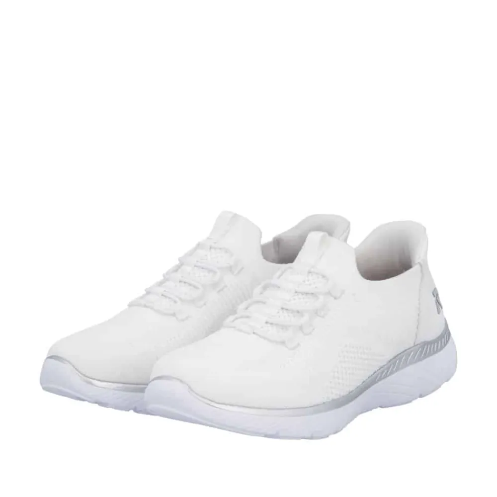 Rieker Ready 2 Go sneakers til dame i hvid. Stilfuld sneakers i hvid med fine detaljer og elastik foran, der tilpasser sig foden og giver en god pasform. Med Hands Free Ready 2 Go teknologi og fast hælkappe kan du nemt komme i skoen uden at bruge hænder. Den bløde Memosoft sål indvendigt sikrer maksimal komfort, mens den stødabsorberende ydersål med mønster giver øget stabilitet og skridsikkerhed i hvert skridt.