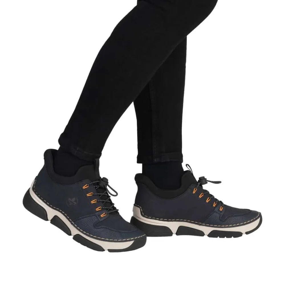 Rieker Ready 2 Go sneakers til dame i blå. Smarte sneakers med Ready 2 Go-teknologi og en fast hælkappe, der gør det nemt at tage skoen af og på uden brug af hænder. Foran har skoen en justerbar elastik, som sikrer en god pasform. Indvendigt bliver du mødt af en udtagelig blød skindsål, der giver komfort hele dagen. Med Rieker Antistress får du øget stødabsorbering og fleksibilitet.