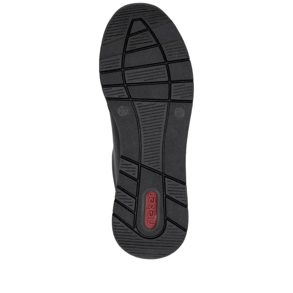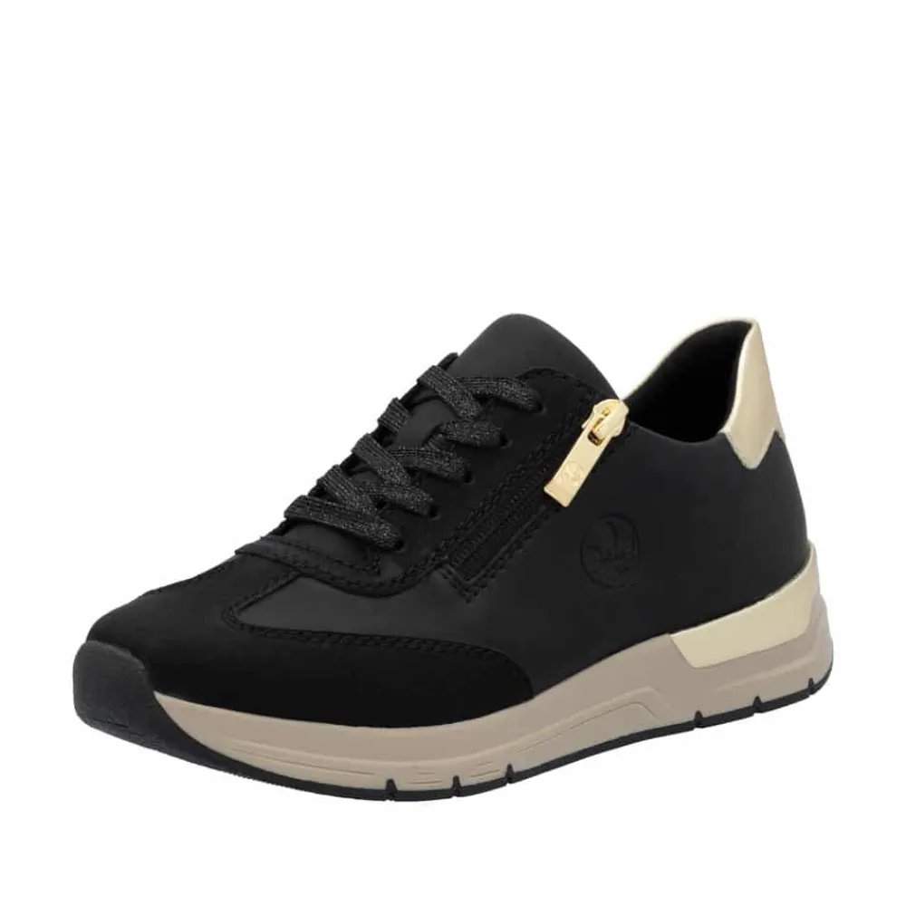 Rieker sneakers til dame i sort. Moderne sneakers i sort med flotte gulddetaljer og snørebånd med glimmer, der giver et feminint og stilfuldt udtryk. Skoen har både snørebånd og en praktisk lynlås i siden, så den er nem at tage af og på. Indvendigt bliver du mødt af en blød og udtagelig Rieker-soft sål, som giver god komfort dagen lang. Den lette og fleksible ydersål med stødabsorbering sikrer støtte og behagelig gang.