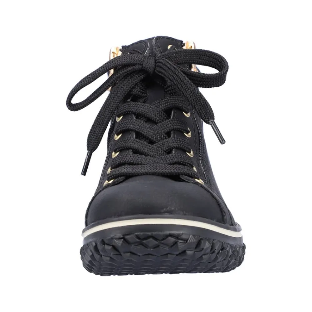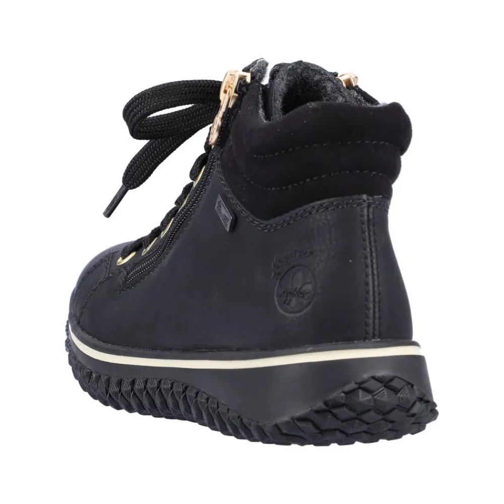 Rieker støvle til dame i sort. Denne sorte støvle med elegante gulddetaljer kombinerer lethed og fleksibilitet, hvilket gør den ideel til hverdagsbrug. Med både snørebånd og to lynlåse er støvlen nem at få af og på, og den lette foring indvendigt gør den komfortabel året rundt. Rieker-Tex-teknologien beskytter mod regn og fugt, så dine fødder forbliver tørre, selv i vådt vejr. Den ikoniske Rieker-sål giver effektiv stødabsorbering og har et skridsikkert mønster, der sikrer stabilitet på glatte overflader.