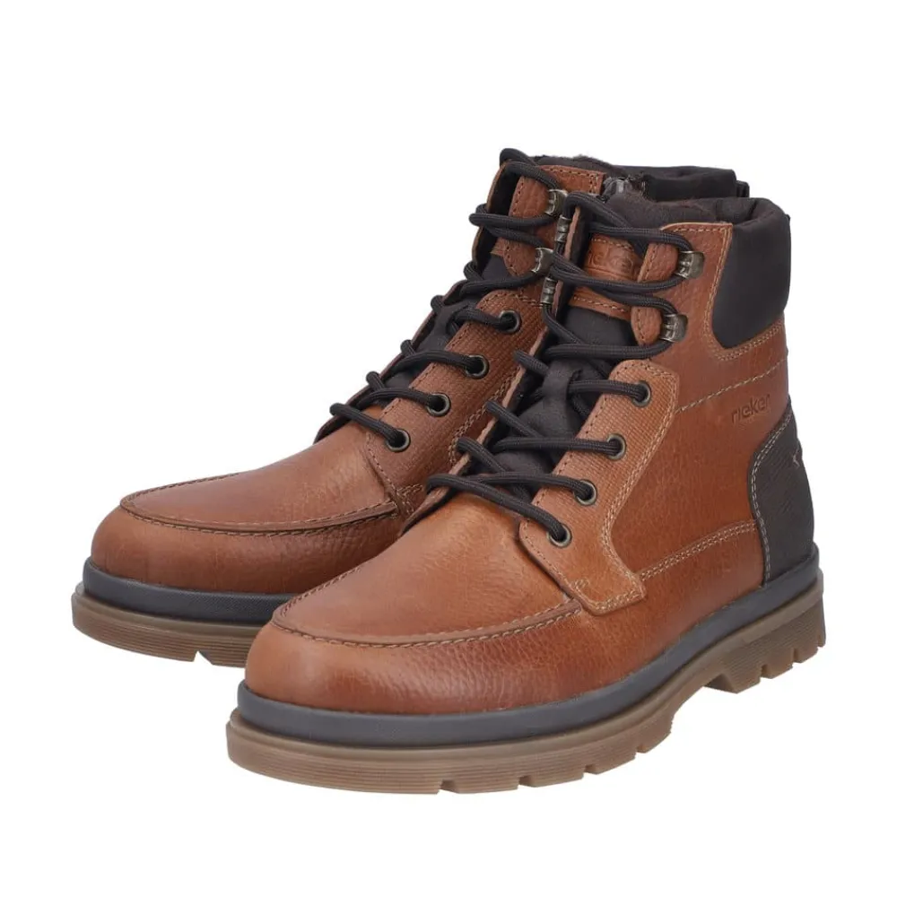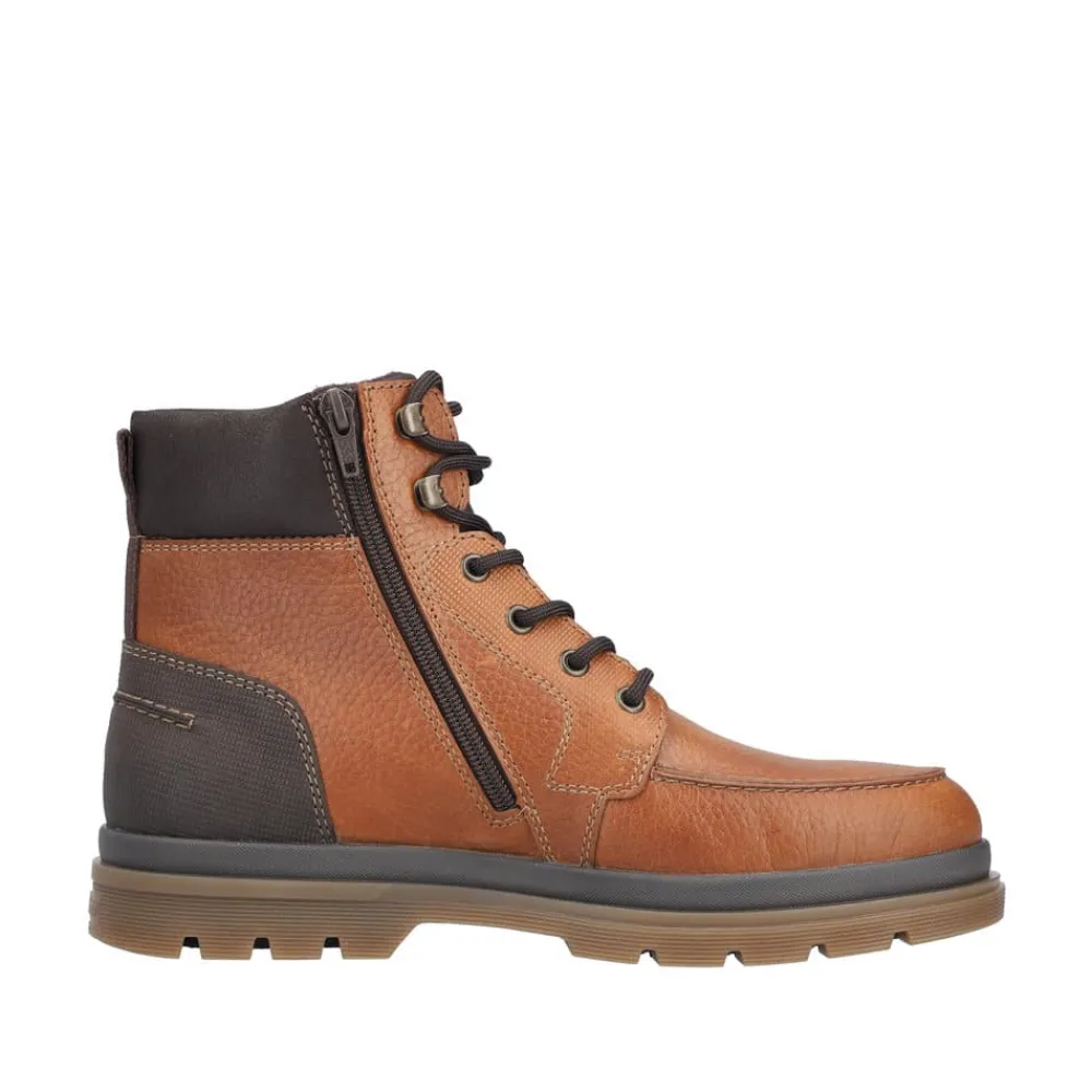 Rieker støvle til herre i brun. Denne brune støvle i skind forener moderne stil med praktiske detaljer. Snørebåndet foran gør det let at justere pasformen, og lynlåsen på siden gør modellen hurtig at tage af og på. Indvendigt mødes du af en blød udtagelig sål og en let foring, mens den ekstra bredde (H) giver mere plads og fleksibilitet til foden. Ydersålen med mønster giver både øget stødabsorbering og skridsikkerhed, så støvlen er behagelig at bruge hele dagen.