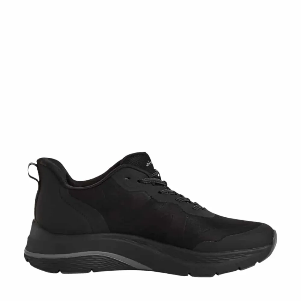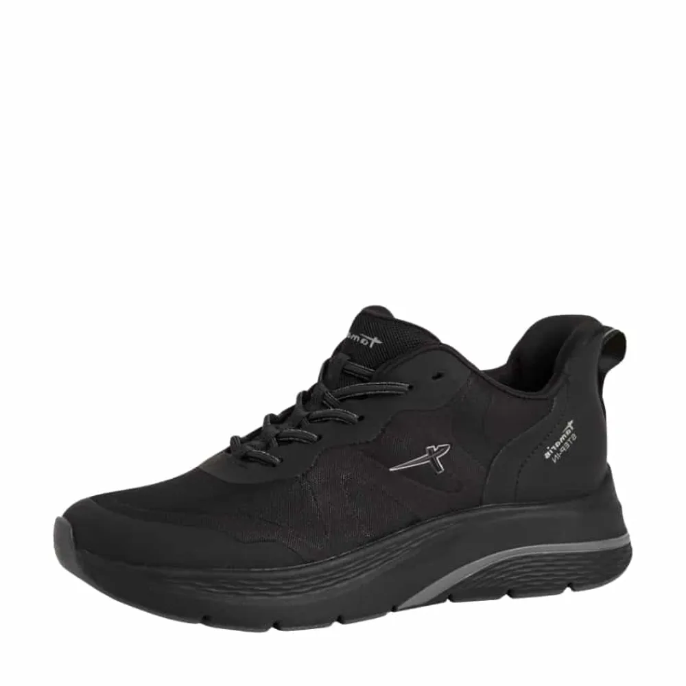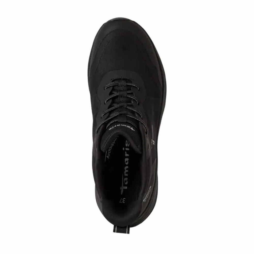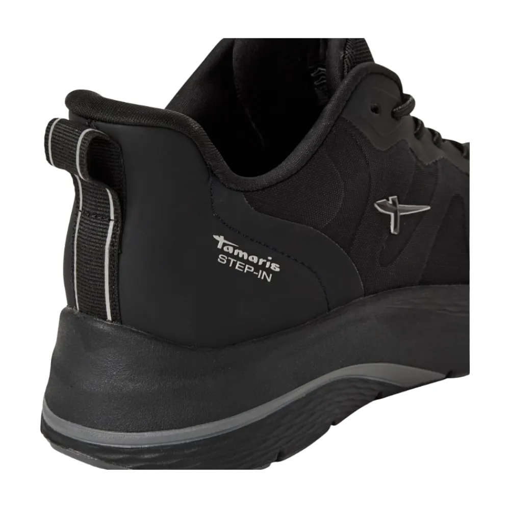 Tamaris Step-In sneakers til dame i sort. Disse sorte sneakers kombinerer et stilrent look med praktiske detaljer, der gør hverdagen lettere. Med Step-In funktion og en fast hælkappe er skoene nemme at tage på uden brug af hænder. Elastikken foran tilpasser sig foden for en behagelig pasform, mens meshoverdelen sikrer, at fødderne holdes friske. Indersålen er blød og har svangstøtte, der giver komfort hele dagen, og med en hælhøjde på 4 cm og mønstret ydersål får du både stil og øget skridsikkerhed i en.