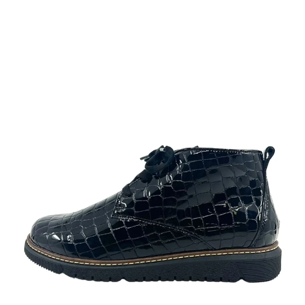 Waldläufer støvle til dame i sort lak. Denne sorte støvle skiller sig ud med sin lakoverdel og det stilfulde krokomønster, som giver designet et moderne touch. Overdelen i 100% skind er udstyret med snørebånd og lynlås, hvilket gør støvlen nem at få på. Indvendigt er der en blød, udtagelig indersål med ekstra bredde K for en rummelig pasform og en let foring, der holder fødderne lune og komfortable. Ydersålen er robust og mønstret for at give øget skridsikkerhed og stabilitet i hvert skridt.