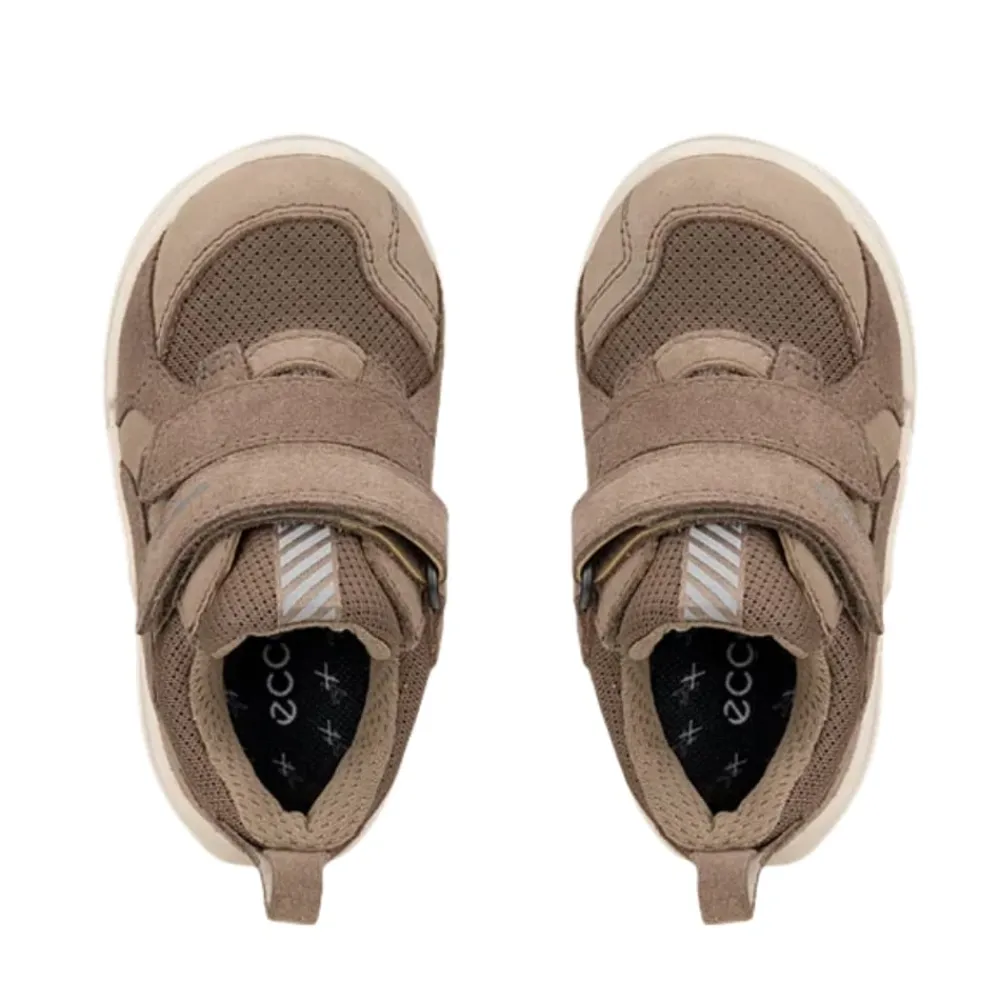 Ecco Biom 2.2 Infant sneakers til børn i brun. Denne børnesneakers i brun kombinerer smarte detaljer med funktionel komfort. Ruskinds detaljerne giver skoen et fint udtryk, og de to velcroremme gør det nemt at få den på og tilpasse pasformen. Indvendigt finder du en udtagelig indersål med Biom Natural Motion®, som støtter fodens naturlige bevægelser og giver blød komfort. Med Ecco’s Waterproof membran er skoen 100% vandtæt, der gør den ideel til leg og aktiviteter. Ydersålen har Phorene™ teknologi, som sikrer stødabsorbering og støtte dagen igennem, mens mønsteret i sålen sørger for øget skridsikkerhed.