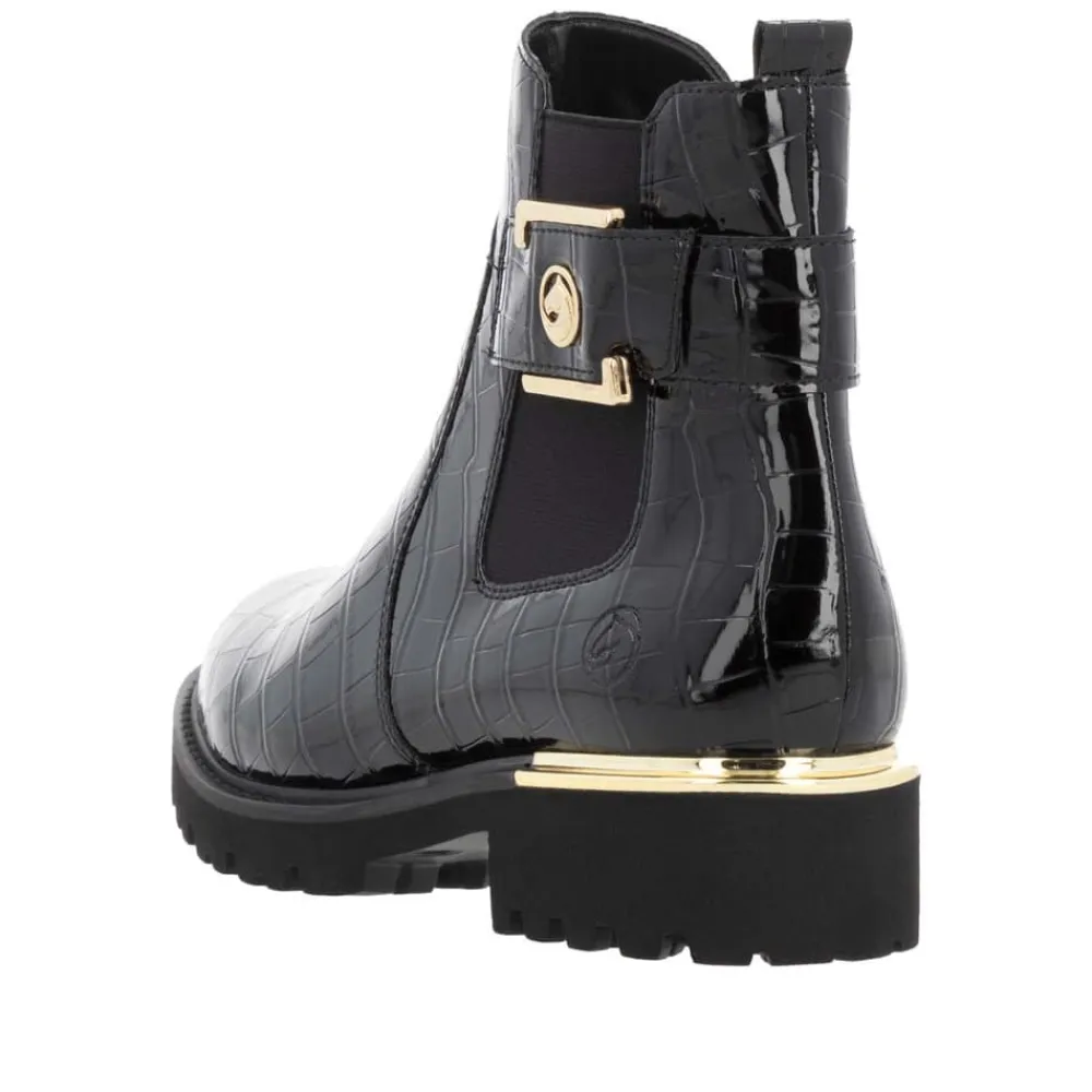 Remonte støvle til dame i sort. Denne super moderne støvle i en elegant sort farve med krokodillemønster og lak finish giver et ekstra sofistikeret touch. Støvlen er smukt dekoreret med gulddetaljer på siden og bag hælen. Indvendigt bliver du mødt af en let foring og en blød indersål, der kan tages ud efter behov. Med den praktiske lynlås på indersiden og elastikken på ydersiden er det nemt og hurtigt at tage støvlen af og på. Den robuste chunky sål med et godt mønster giver øget støtte og skridsikkerhed.
