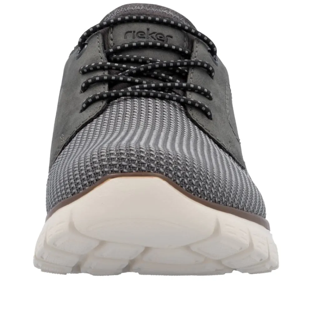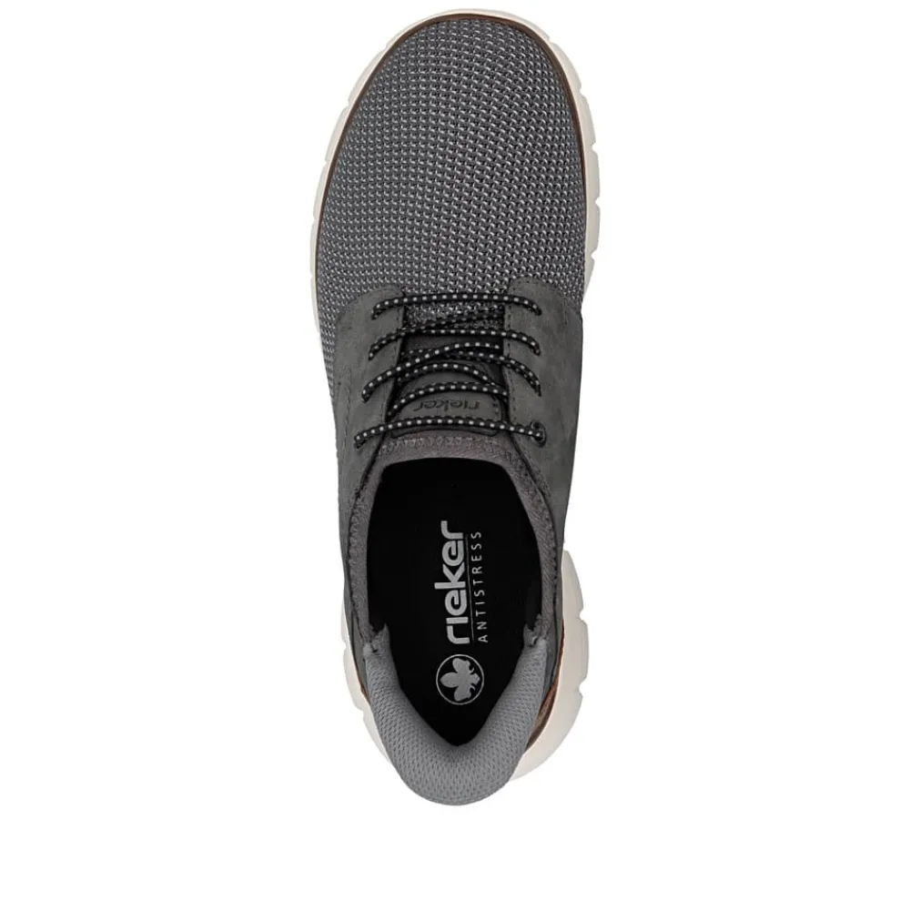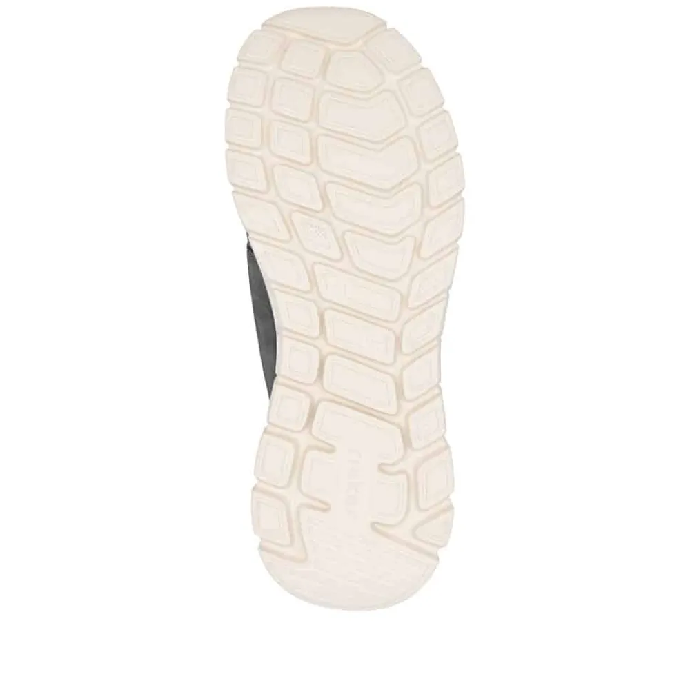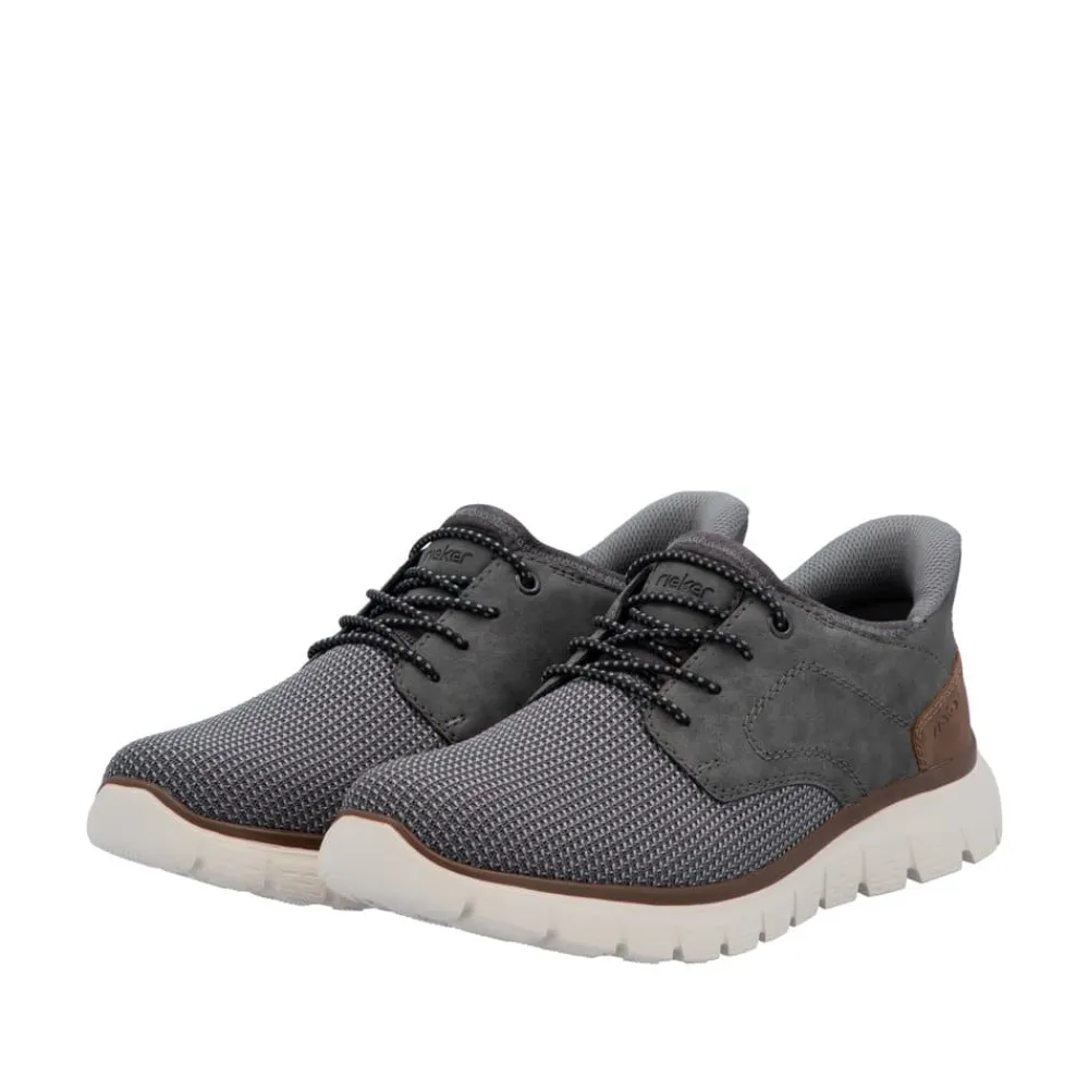 Rieker Ready 2 Go sneakers til herre i grå. Flot grå sneakers, der kombinerer moderne design med maksimal komfort. Skoen er udstyret med Rieker Ready 2 Go-teknologi og en fast hælkappe, så du let kan tage den på uden hænder. Den elastiske front og fleksible konstruktion sørger for en behagelig pasform, mens den bløde indersål giver komfort ved hvert skridt. Den mønstrede ydersål med stødabsorbering giver stabilitet og øget skridsikkerhed.