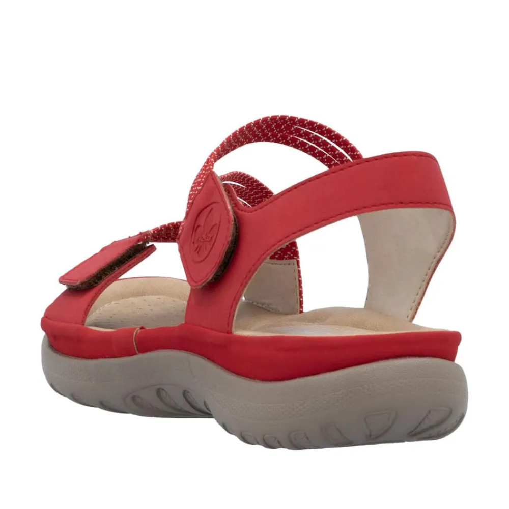 Rieker sandal i rød til dame. Rieker vandre-sandalen i rød er det perfekte valg til en aktiv hverdag. Den bløde sål og den fleksible EVA-sål sørger for god komfort hele dagen, mens de justerbare velcrolukninger og elastikken over vristen sikrer en nem og præcis pasform. Den lette og skridsikre sål gør sandalen perfekt til både lange gåture og afslappende stunder.