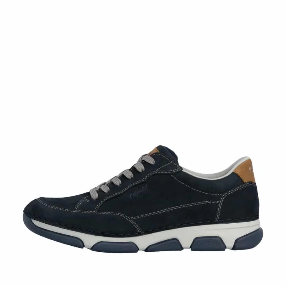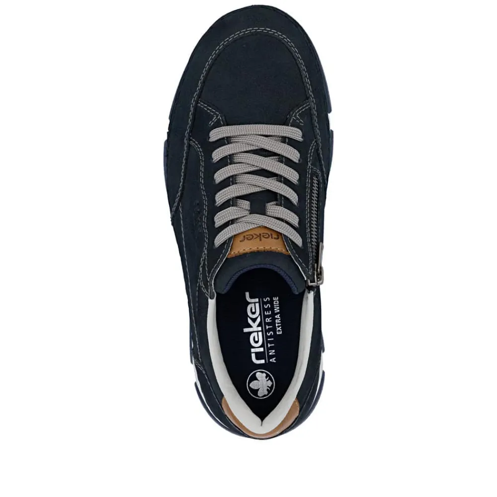 Rieker sneakers til herre i mørkeblå. Flotte og elegante sko med skindoverdel og fine detaljer, der giver et stilfuldt udtryk til både hverdag og pænere brug. Skoen har både snørebånd og en funktionel lynlås, som gør det let at komme i og af og samtidig giver mulighed for at justere pasformen. Indvendigt er skoen udstyret med en blød og udtagelig sål samt ekstra bredde (H), der sikrer høj komfort hele dagen. Ydersålen er designet med et mønster, som giver øget støtte og skridsikkerhed i hvert skridt.