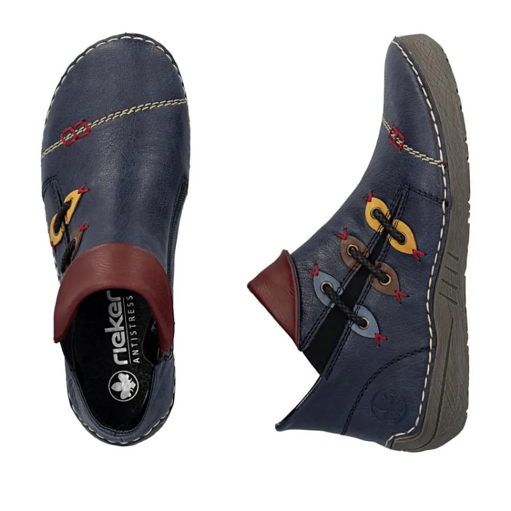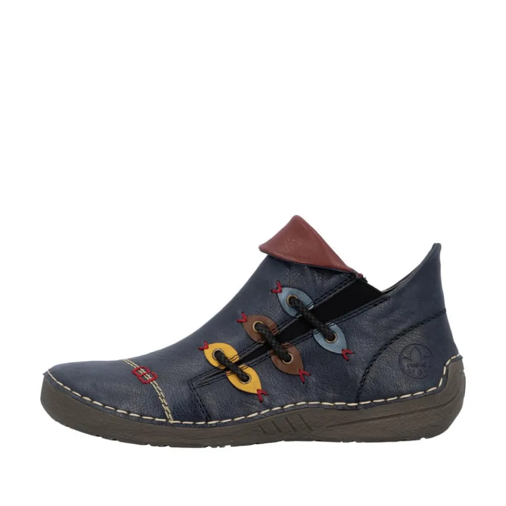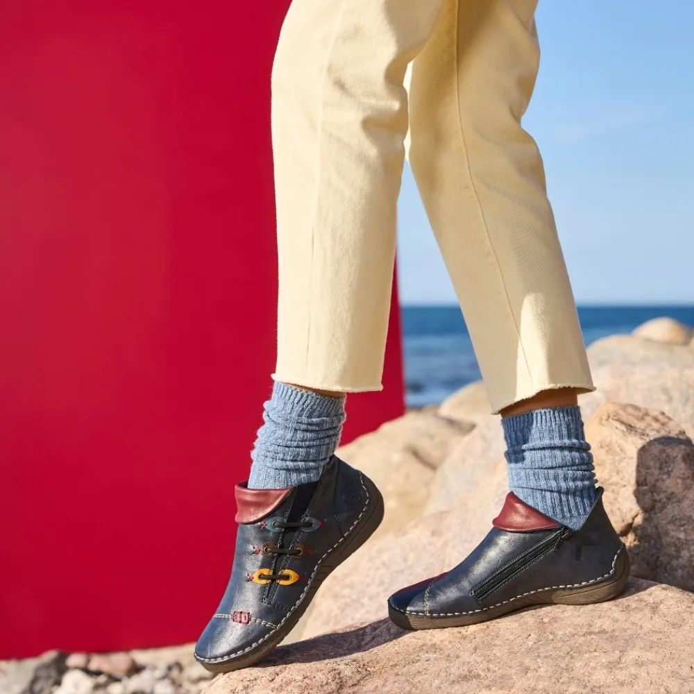 Rieker støvle til dame i blå. Denne model har en smart blå farve og praktiske detaljer, der gør den nem at bruge i hverdagen. Lynlåsen på indersiden og elastikken på ydersiden gør det hurtigt at komme i og af skoen. Indvendigt finder du en let foring og en blød Rieker-soft sål, som giver god komfort hele dagen. Ydersålen er mønstret og bidrager til både stødabsorbering og skridsikkerhed, så du står stabilt og går trygt.