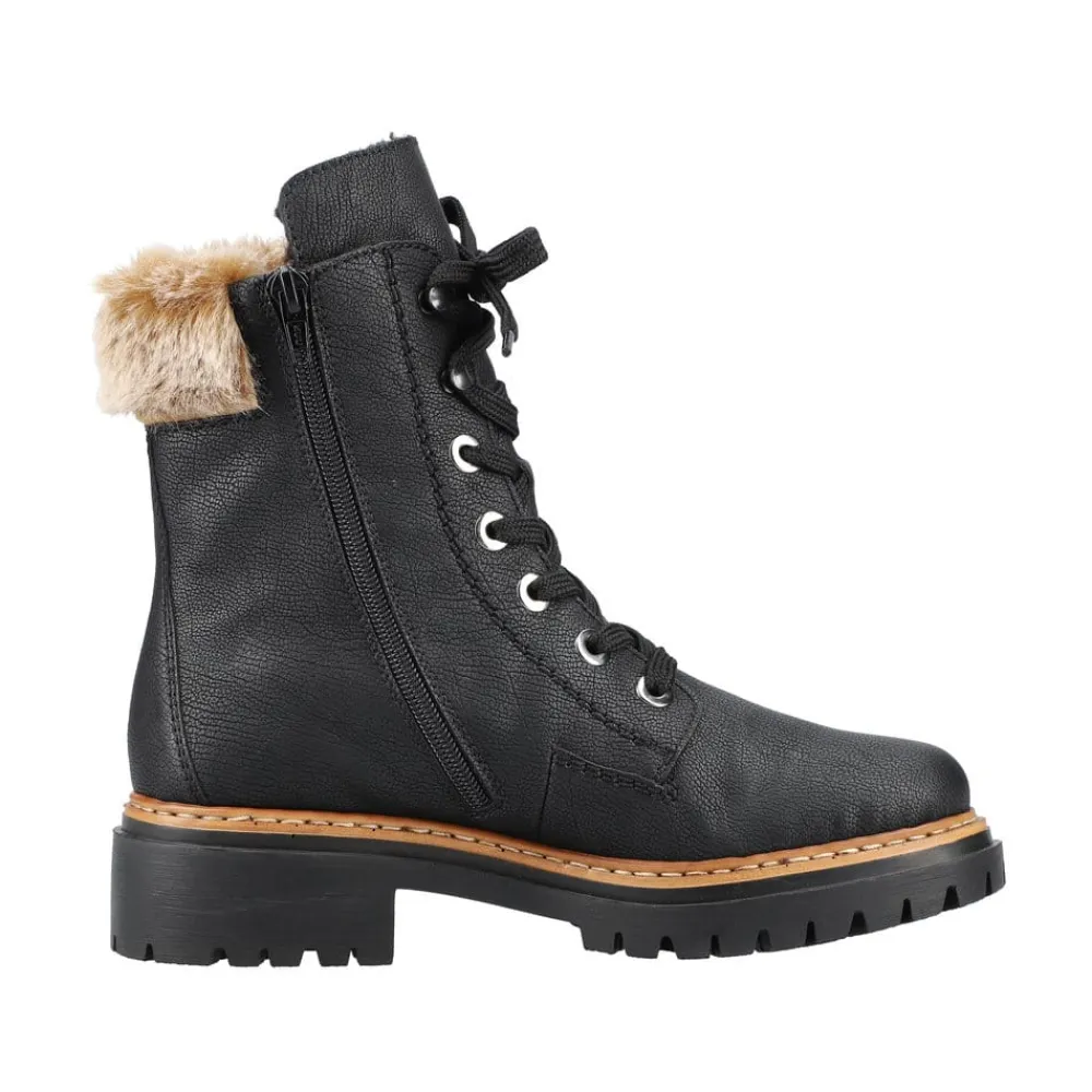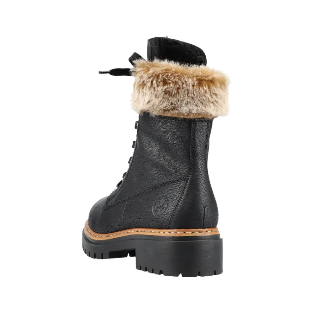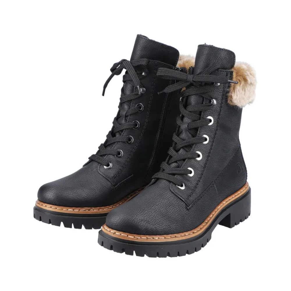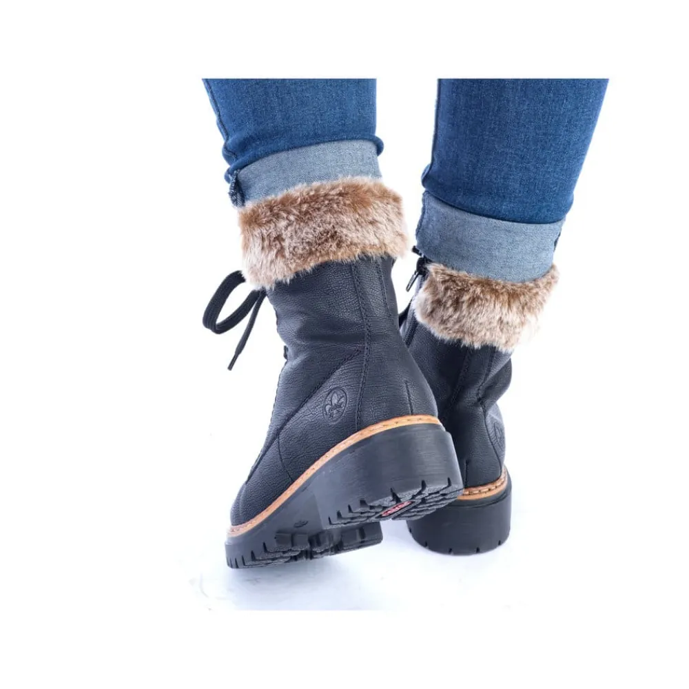 Rieker vinterstøvle til dame i sort. Disse sorte vinterstøvler giver både stil og komfort. De er lavet med en særlig teknik, der gør dem ekstra holdbare og fleksible. Snørebåndene og lynlåsen sikrer en god pasform og støtte. En flot skaftkrave med pels tilføjer et moderne look. Den lette sål og blokhælen giver stødabsorbering ved hvert skridt, mens den bløde indersål gør dem ekstra behagelige. Den varme foring holder dine fødder varme hele dagen, selv i kolde temperaturer.