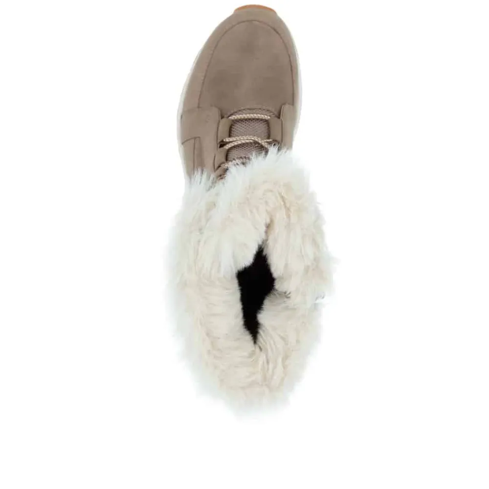 Rieker støvle til dame i beige. Moderne beige støvle i ruskind med smarte detaljer, der giver et stilrent og feminint udtryk. Støvlen har snørebånd foran og en funktionel lynlås på indersiden, som gør den nem at tage på. Indvendigt sørger en blød, udtagelig indersål og en varm uldforing for høj komfort og lune fødder. Takket være Rieker-Tex er støvlen kraftigt vandafvisende, mens den stødabsorberende ydersål med mønster giver bedre støtte og skridsikkerhed.