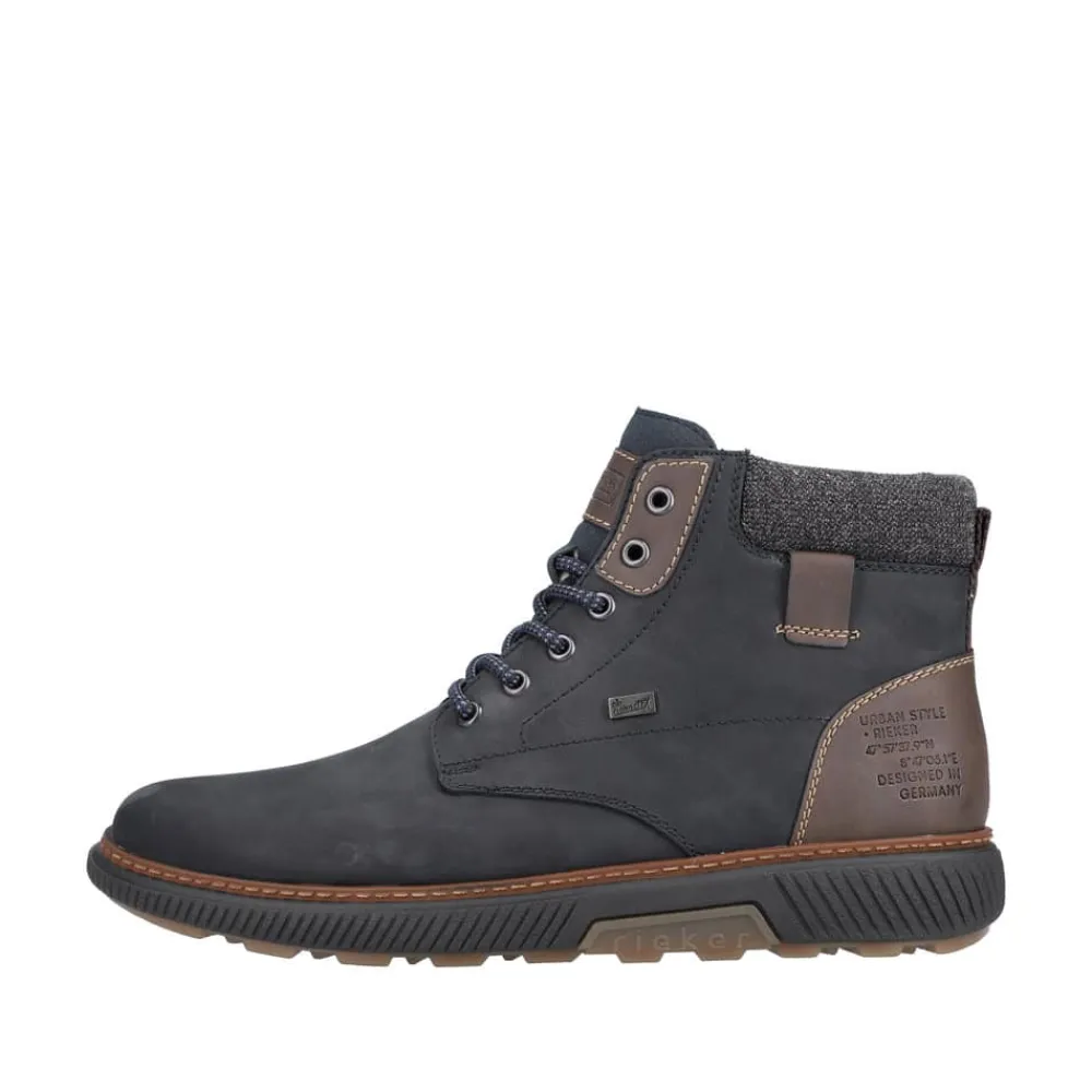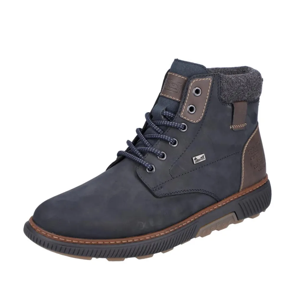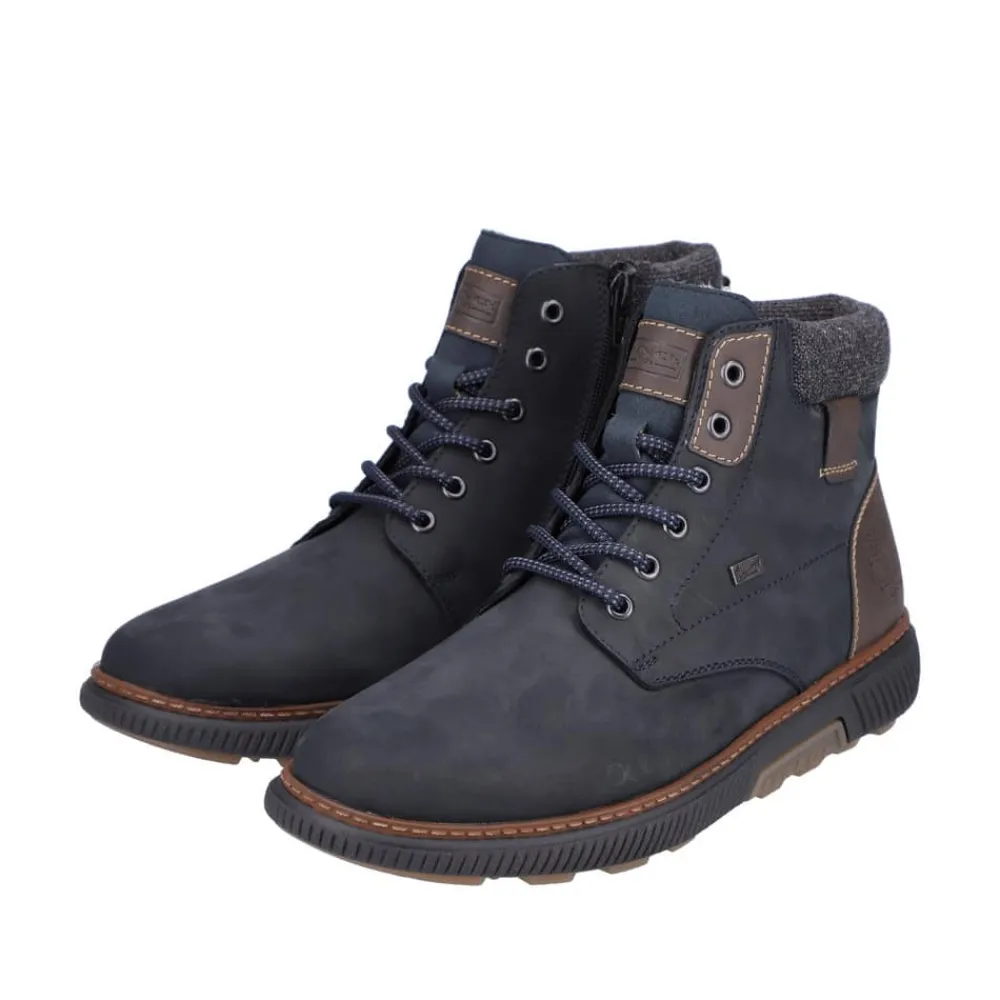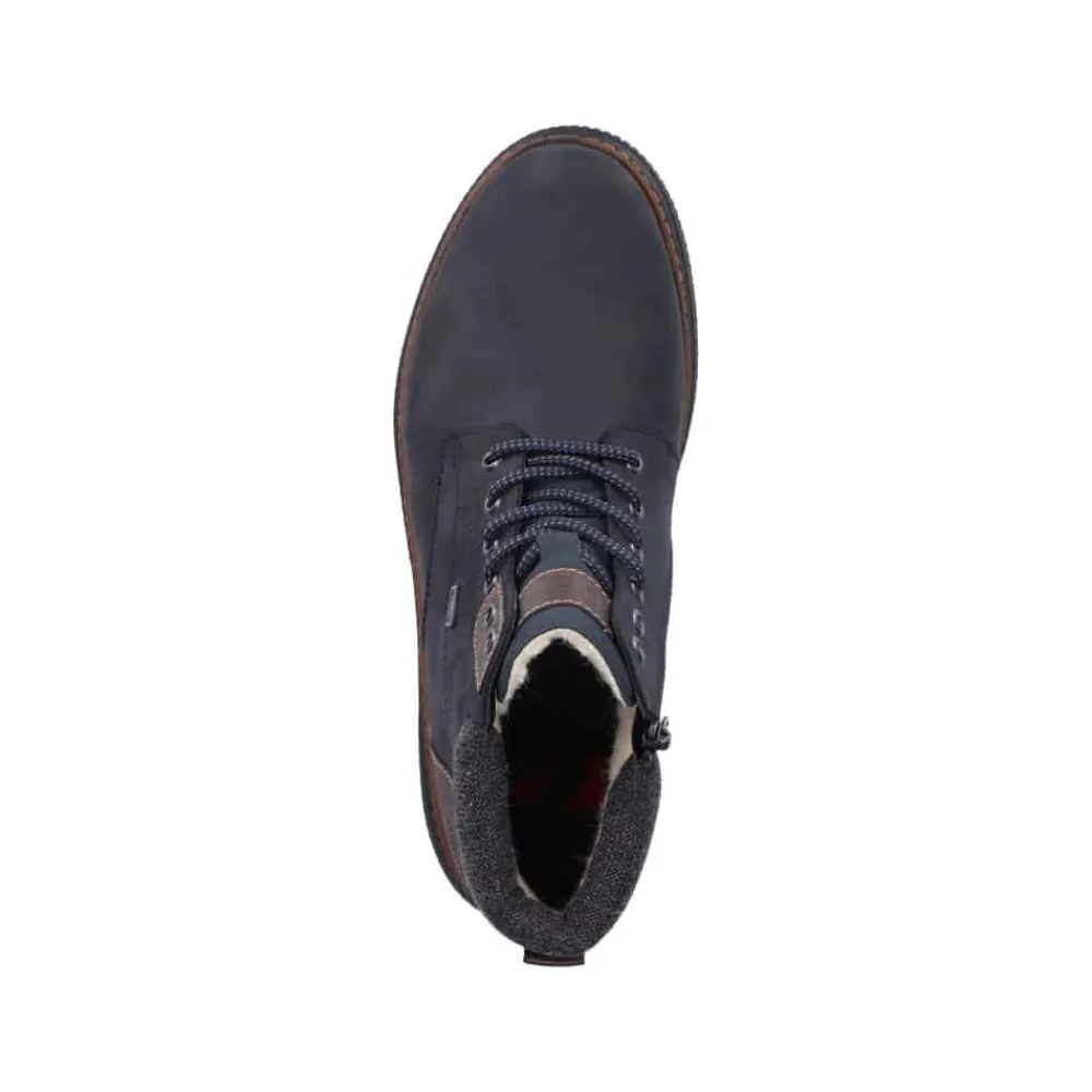 Rieker støvle til herre i mørkeblå. Disse mørkeblå snørestøvler i ruskind fra Rieker har den perfekte kombination mellem komfort og stil. Kombinationen af snørebånd og lynlås giver en god pasform og støtte. Den lette sål sikrer alsidig ydeevne, mens den bløde, udtagelige indersål øger komforten. Støvlen har en ekstra bred H-pasform, som giver mere plads til fødderne. Med RiekerTEX, der holder vand ude, og den varme uld foring, forbliver dine fødder både varme og tørre uanset vejret.