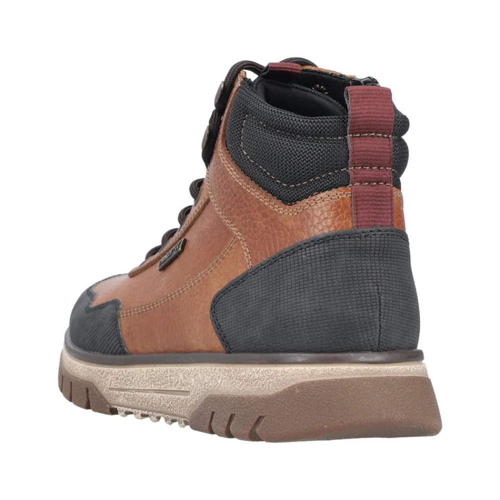 Rieker støvle til herre i brun. Stil og komfort går hånd i hånd med denne praktiske skindstøvle. Modellen er designet med både snørebånd og lynlås, så støvlen er let at tage på og samtidig kan du tilpasse pasformen. Indvendigt finder du en blød udtagelig sål og varm foring samt ekstra bredde (H), som giver en god komfort. Støvlen er udstyret med Rieker-Tex der gør modellen kraftig vandafvisende, mens den mønstrede ydersål giver øget stødabsorbering og skridsikkerhed.