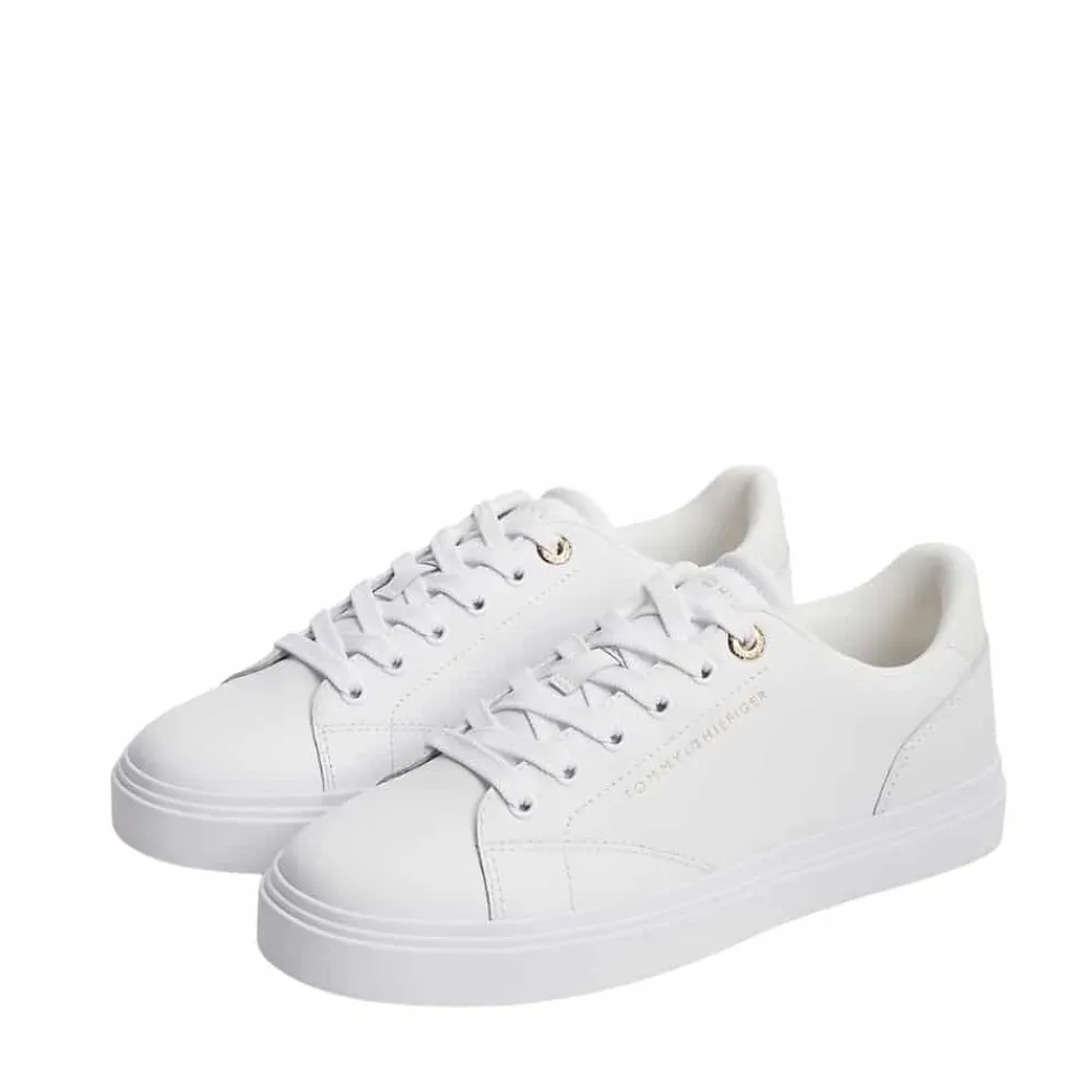 Tommy Hilfiger Feminine Cupsole sneakers til dame i hvid. Klassisk sneakers i hvid med enkle gyldne detaljer, der giver et moderne og stilrent udtryk. Skoen har en blød overdel i ægte skind, som føles behagelig på foden, og snørebånd foran gør det nemt at justere pasformen. Indvendigt bliver du mødt af en blød og udtagelig indersål, der giver god komfort dagen igennem. Den solide ydersål bidrager med stabil støtte, så skoen er velegnet til hverdagsbrug.