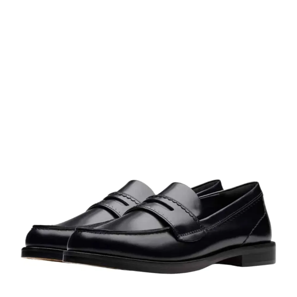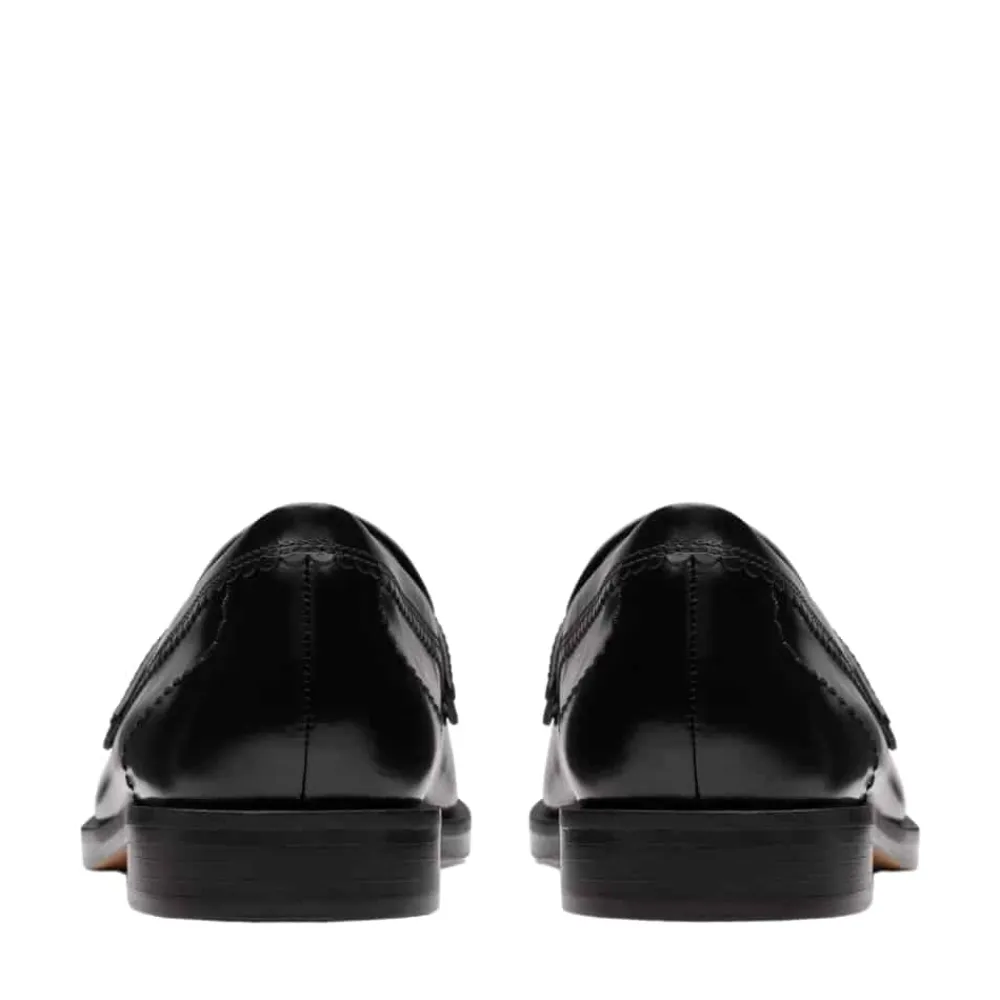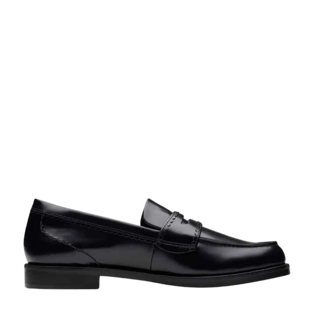 Clarks Straven Edge loafers til dame i sort. Stilrene loafers i sort med et enkelt design og elegante detaljer, der tilfører et moderne udtryk. Overdelen er lavet af blødt læder med unikke bølgede detaljer, der giver skoen karakter. Indvendigt finder du en Contour Cushion indersål med målrettet skum, som sikrer komfort hele dagen. Den lille hæl på ca. 2 cm giver et elegant løft. Bemærk, at modellen er lille i størrelsen.
