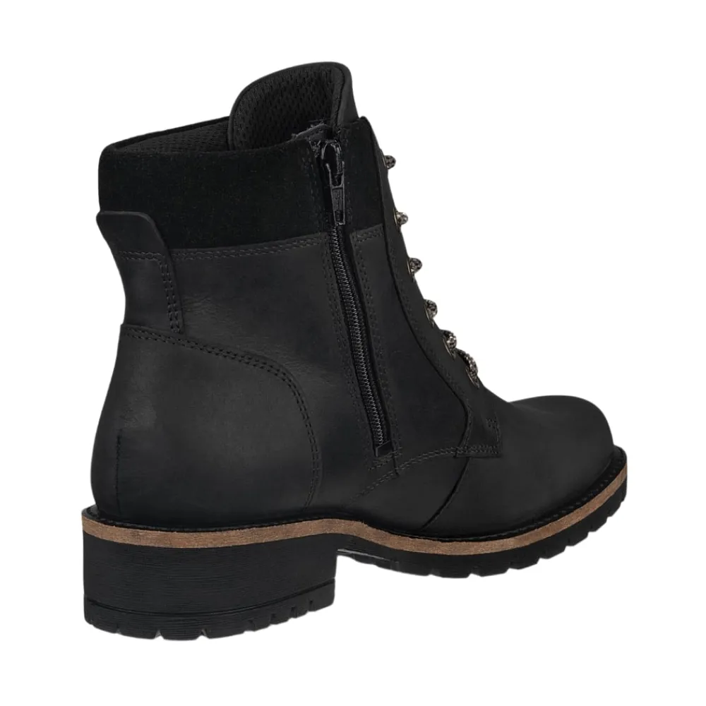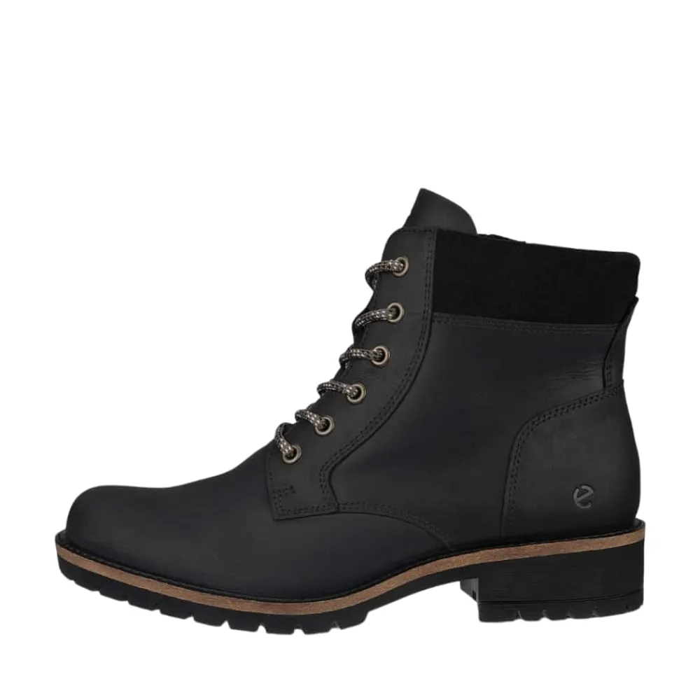 Ecco Elaina støvle til dame i sort. Oplev den perfekte kombination af stil og komfort med denne smarte ankelstøvle. Overdelen er lavet i blødt nubucklæder, og den funktionelle lynlås på indersiden gør det let at tage støvlen af og på. Snørebåndene foran giver en justerbar pasform, mens den bløde, udtagelige indersål sikrer høj komfort. Med Ecco Fluidform™ følger støvlen fodens naturlige bevægelser. Den solide ydersål med en blokhæl på ca. 4 cm og et godt mønster giver stabilitet, støtte og øget skridsikkerhed hele dagen.