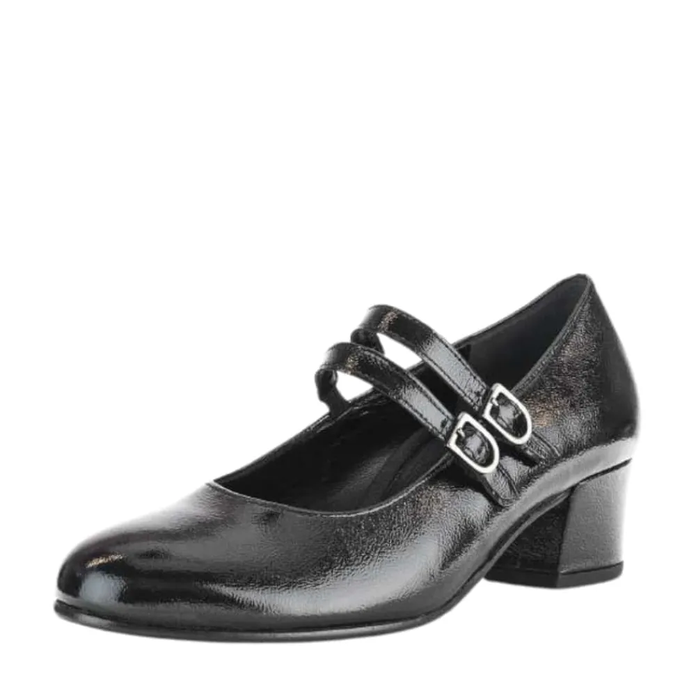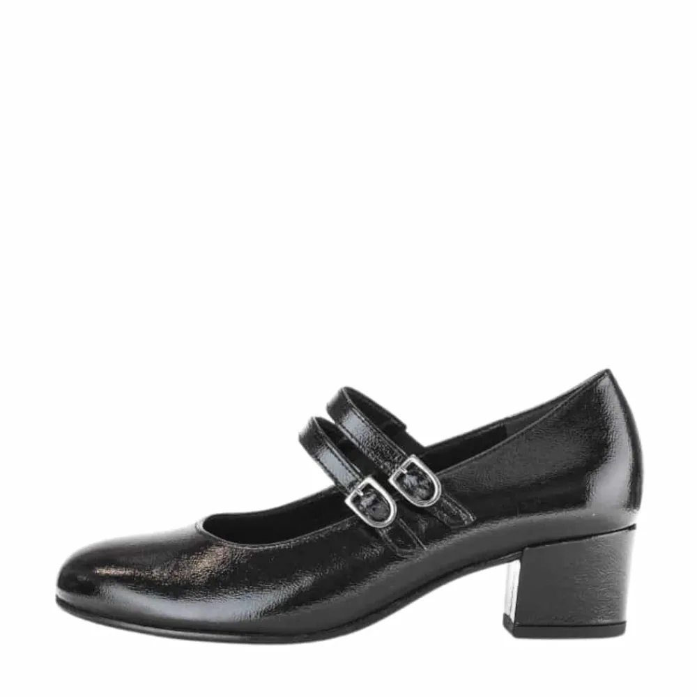 Gabor pumps til dame i sort lak. Denne moderne damesko i sort er designet med en elegant lakoverdel, som tilføjer et sofistikeret udtryk. Skoen har to remme med justerbare spænder og en lille elastik over vristen, der sikrer en god og fleksibel pasform. Indvendigt giver den bløde skindsål og ekstra vidde G både komfort og rummelighed. Den 5 cm høje blokhæl giver et stilfuldt løft, uden at det går ud over komforten.