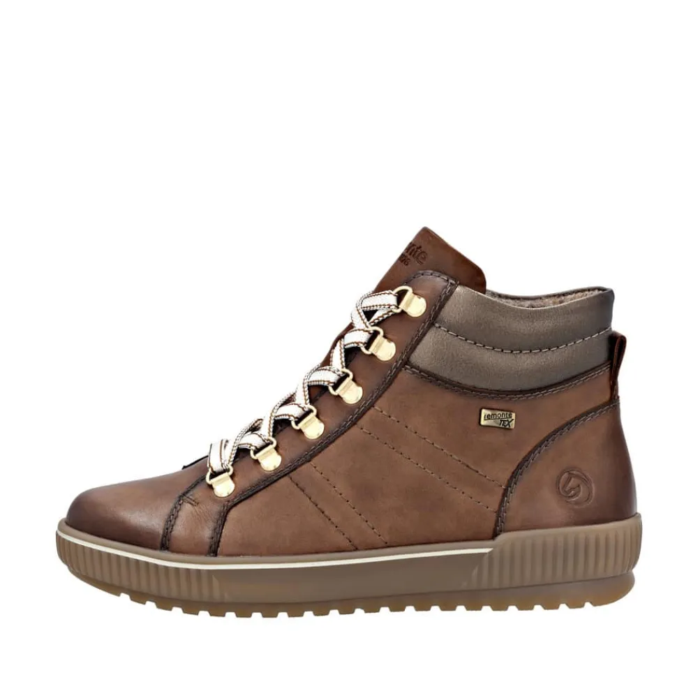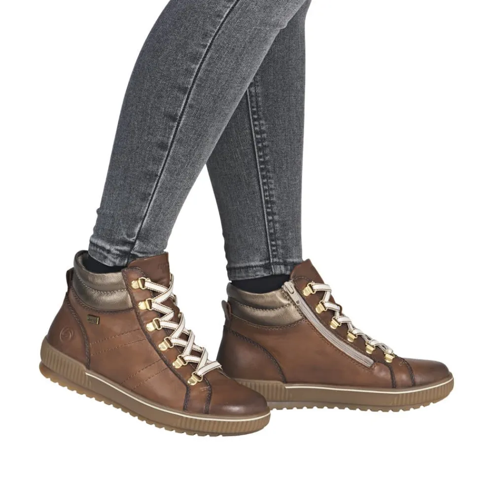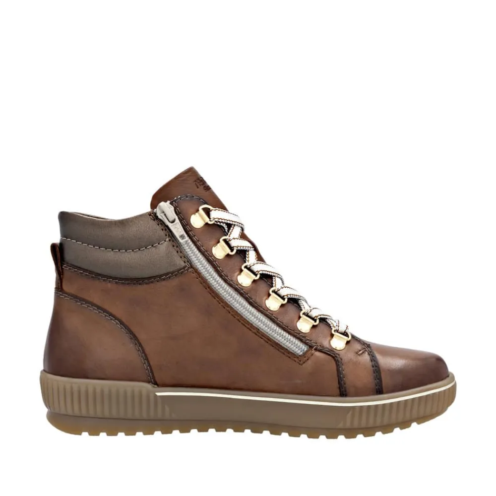 Remonte støvle til dame i brun. Denne brune støvle kombinerer stil og komfort på bedste vis. Overdelen er i skind, og med justerbare snørebånd som kan skiftes samt en praktisk lynlås på indersiden er den nem at tage af og på. Indvendigt finder du en blød og udtagelig Remonte Soft sål, der giver komfort hele dagen. Støvlen har ekstra bredde G, som sikrer god rummelighed og Remonte-Tex der gør den kraftig vandafvisende. Den solide ydersål med mønster giver øget skridsikkerhed, mens de stødabsorberende egenskaber bidrager til en behagelig gangoplevelse.
