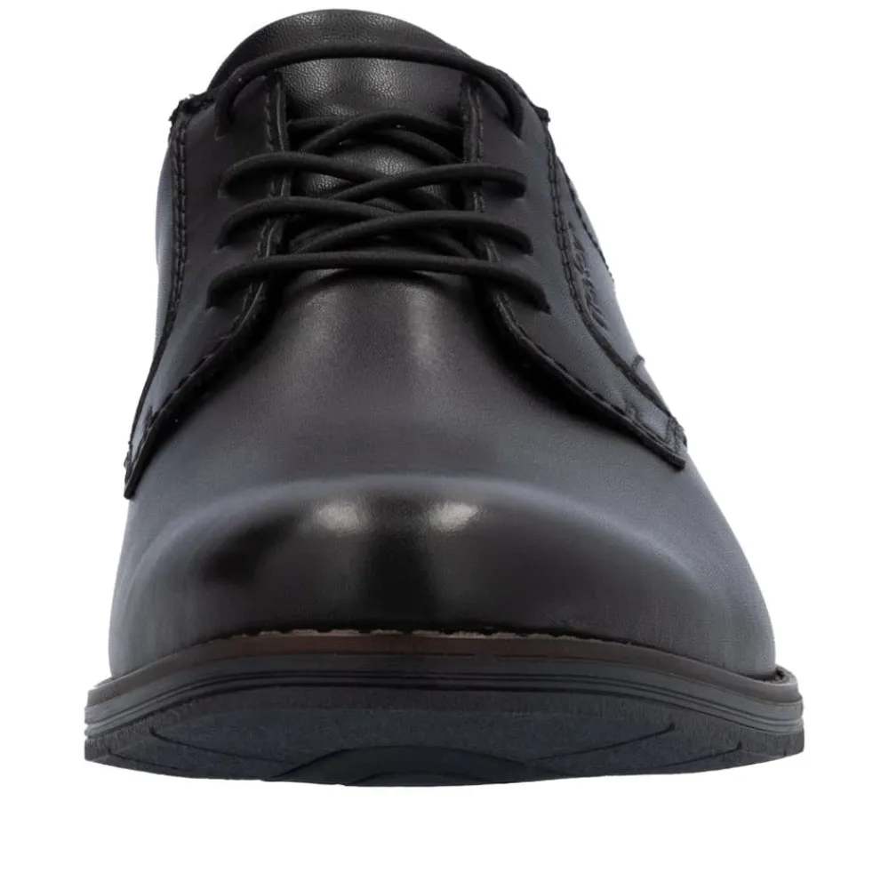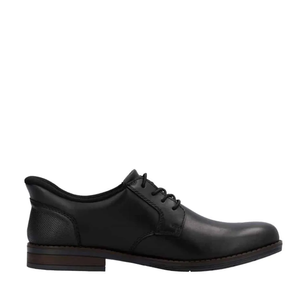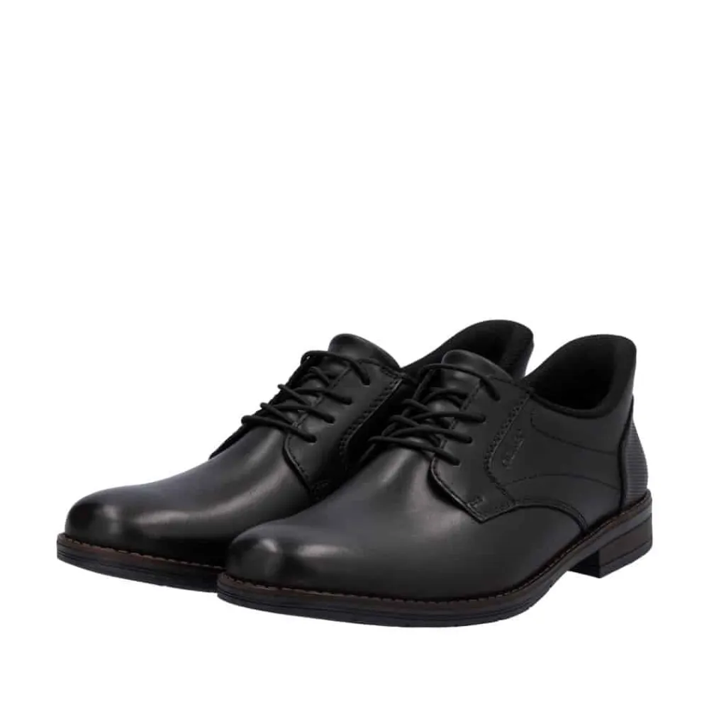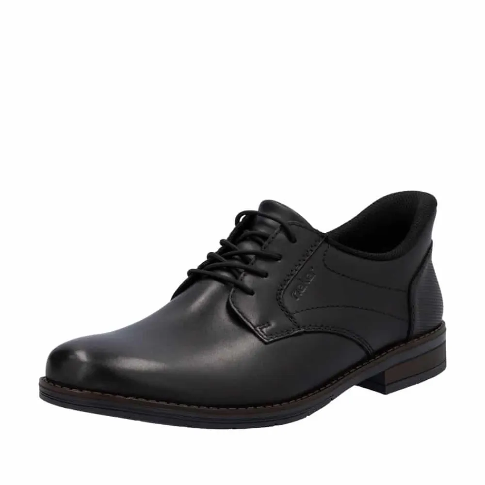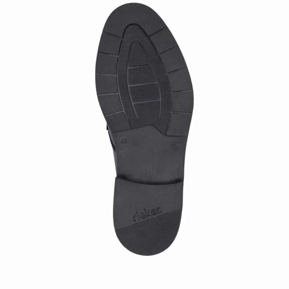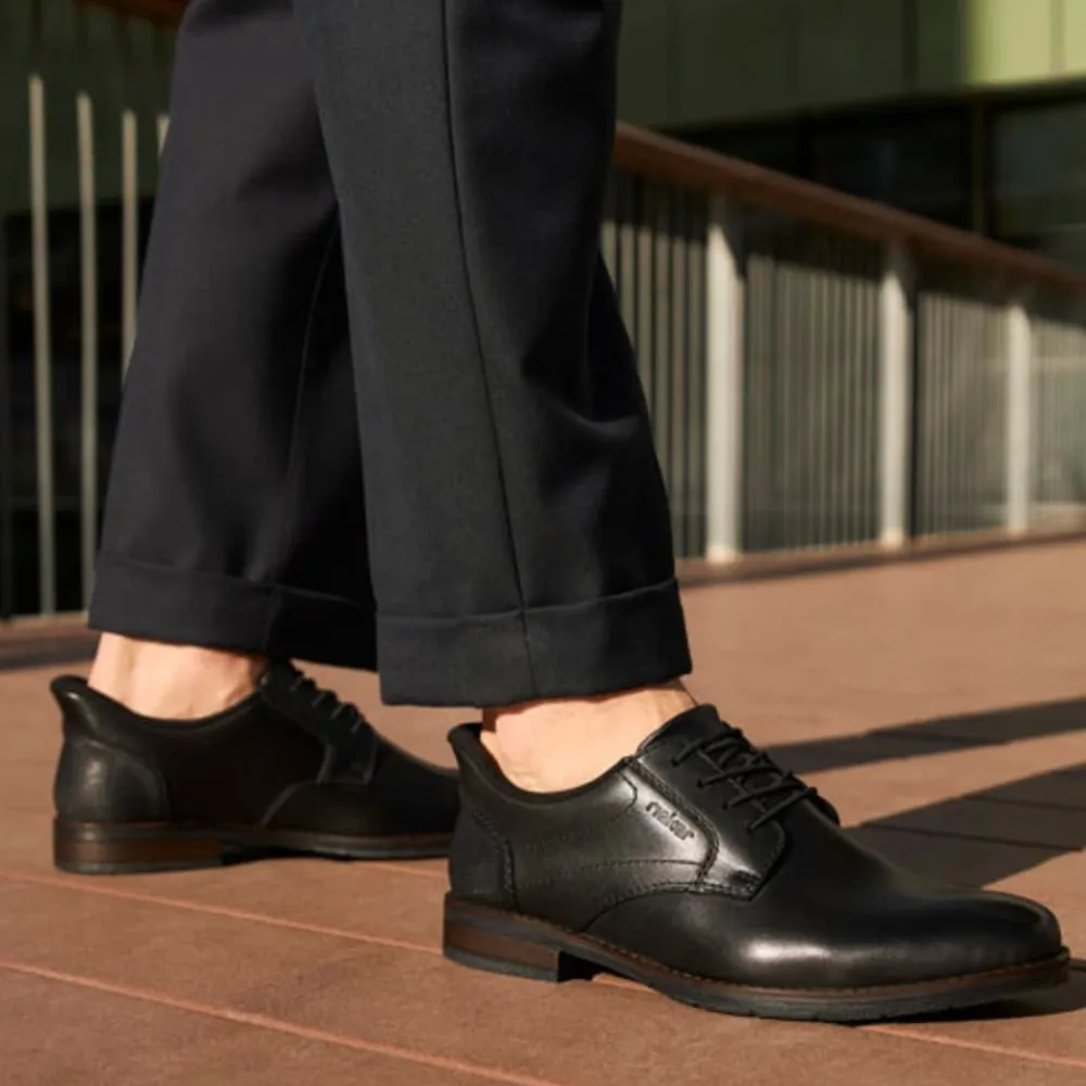 Rieker Ready 2 sko til herre i sort. Ready 2 GO-funktionen gør det nemt og hurtigt at glide i disse sorte Rieker sko uden brug af hænder, mens den faste hælkappe sikrer, at skoen holder sin form. Fremstillet i glat læder kombinerer skoene praktisk design med et elegant look. Den klassiske konstruktion gør skoen både robust og fleksibel for en perfekt pasform. De elastiske indsatser gør det let at tage skoen af og på, mens de moderne dekorative syninger tilfører et stilfuldt touch. Den skridsikre TR-sål sikrer et stabilt fodfæste, og den bløde indersål giver optimal komfort hele dagen. Ideel til dig, der ønsker at kombinere funktionalitet og elegance i én sko!