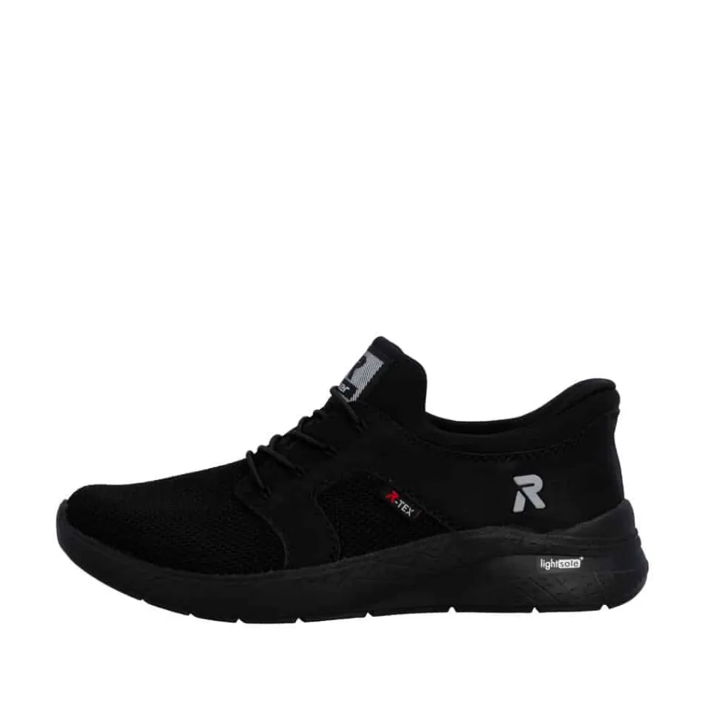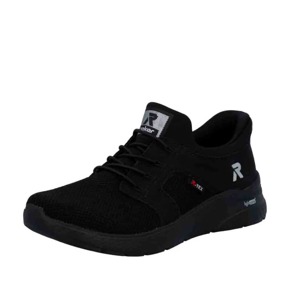 Rieker Ready 2 Go sneakers til dame i sort. Denne sorte sneakers kombinerer et pænt udtryk med god komfort til hverdagen. Elastikken foran gør at skoen sidder godt på foden, mens Rieker Ready 2 Go teknologien sammen med den faste hælkappe gør det muligt at tage skoen på uden brug af hænder. Indvendigt er skoen udstyret med en blød og udtagelig Rieker-Soft sål som giver behagelig komfort hele dagen. Rieker-Tex gør skoen kraftigt vandafvisende, og Rieker-Light+ ydersålen giver både lethed, fleksibilitet og effektiv stødabsorbering.