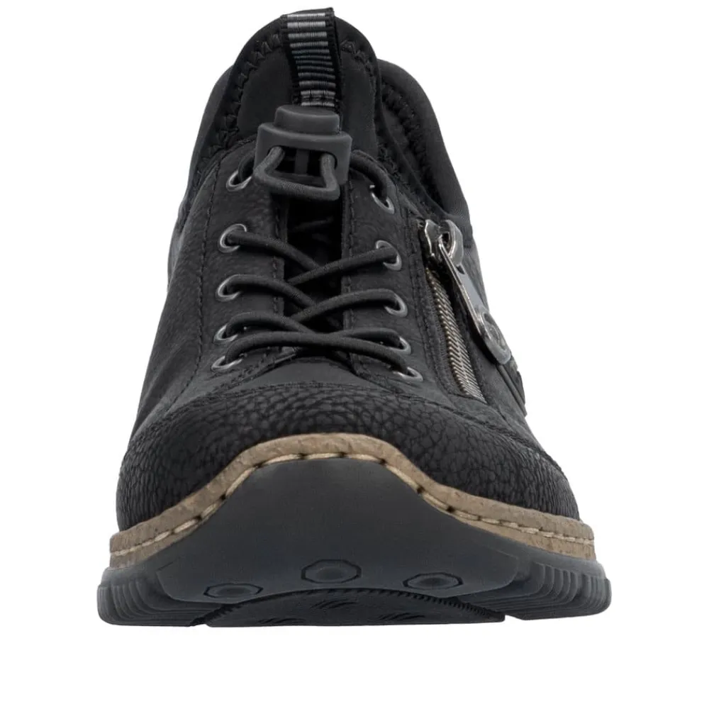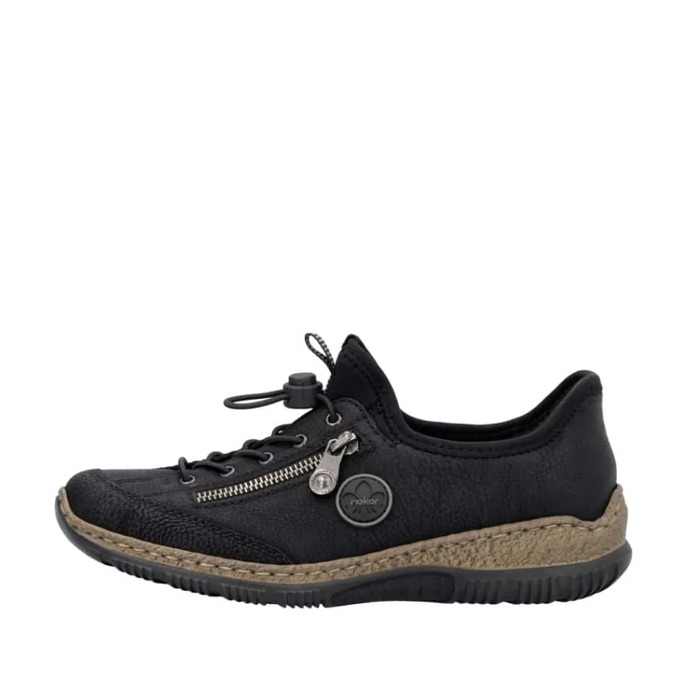 Rieker Ready 2 Go sneakers til dame i sort. Denne sneakers fra Rieker er designet med den innovative Hands Free Ready 2 Go teknologi, der gør det nemt og hurtigt at tage denne sneakers på uden brug af hænder med den faste hælkappe og en smart elastiklukning. Den lette, stødabsorberende sål sikrer dine fødder optimal komfort ved hvert skridt. Derudover giver den ekstra bløde Memosoft indersål en luksuriøs følelse. Designet i flotte og bløde materialer med en pynte lynlås på siden, så spares der hverken på stil eller komfort med denne sko. Tag skridtet og oplev den ultimative skooplevelse i dag med Rieker Ready 2 Go!