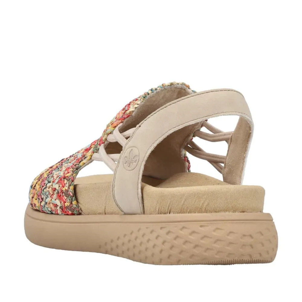 Rieker sandal til dame i farvekombination. Gå sommeren i møde med denne stilfulde og komfortable sandal i en smuk farvekombination. Den farverige vævede rem giver et unikt og moderne udtryk, mens den elastiske pasform sørger for, at sandalen sidder godt om foden. Den bløde indersål giver dejlig komfort, og den chunky ydersål med stødabsorbering sikrer en behagelig gang. Undersålen har et praktisk mønster, der giver øget støtte og skridsikkerhed.