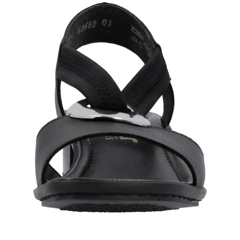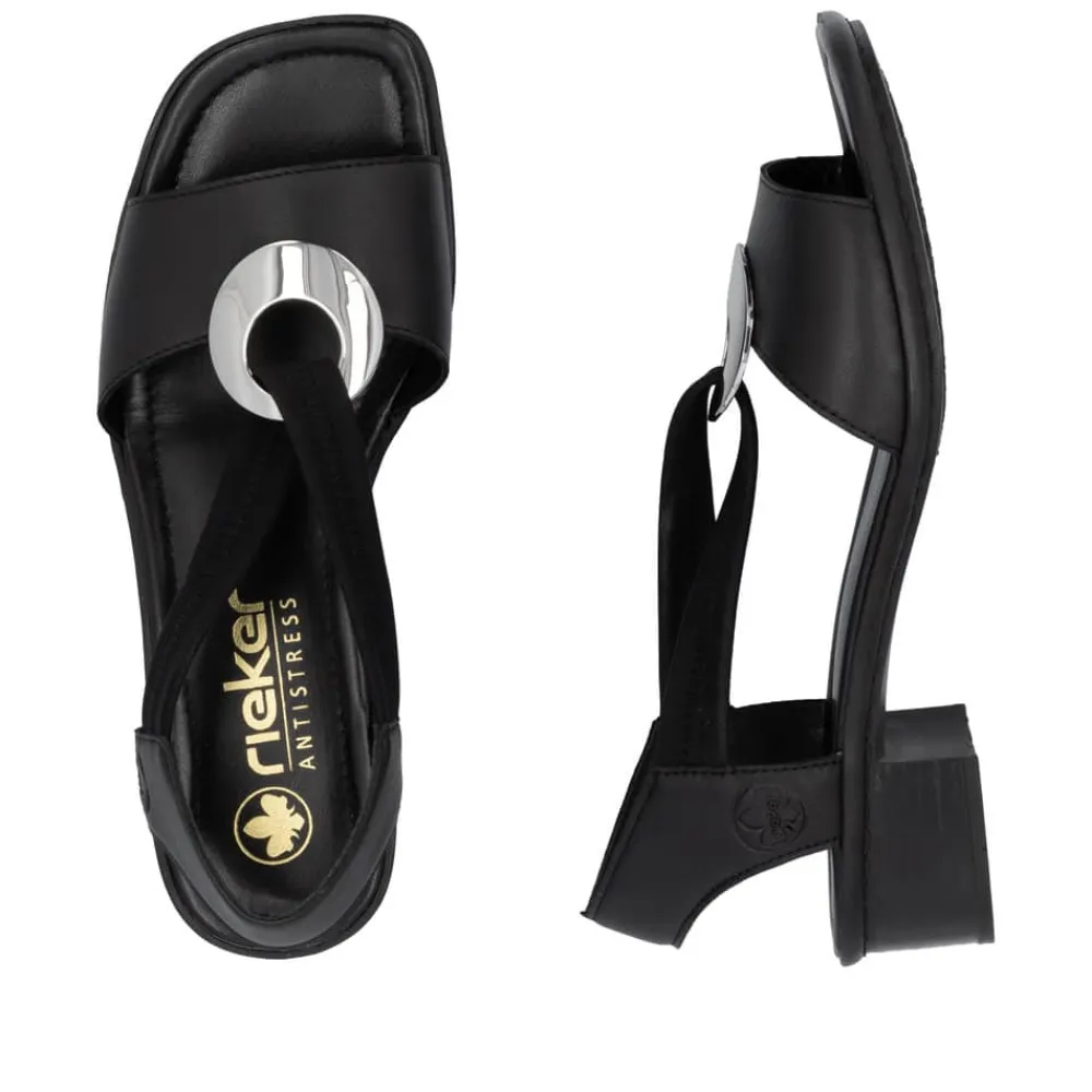 Rieker sandal i sort til dame. Disse sorte Rieker sandaler i glat læder er omhyggeligt håndværkede. Takket være elastikindsatsen er de nemme at tage af og på. Den midterste rem med et cirkulært smykkeelement tilføjer et ekstra touch af elegance. Med den stødabsorberende og lette sål vil dine fødder opleve optimal gåkomfort ved hvert skridt. Sandalen har en slank pasform (E 1/2), der giver god støtte til foden. Disse sandaler har 100% potentiale til at blive dine favoritter, med en behagelig ca. 4 cm blokhæl.