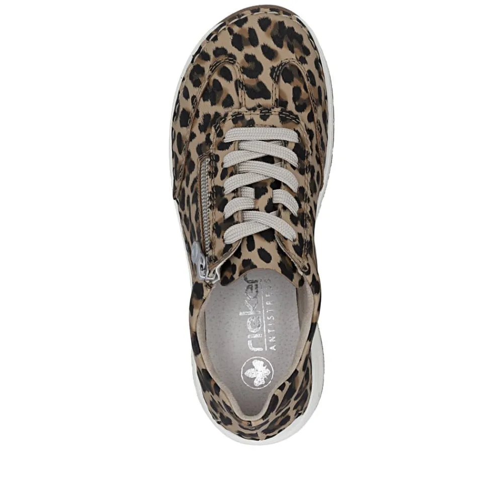 Rieker sneakers til dame i leopard. Denne moderne sko med leopardoverdel og smarte detaljer giver et stilfuldt og iøjnefaldende look. Skoen er udstyret med snørebånd samt en funktionel lynlås, som gør det nemt at komme i og af skoen og samtidig giver mulighed for at tilpasse pasformen. Indvendigt bliver du mødt af en blød skindindersål, der sikrer høj komfort hele dagen. Ydersålen er designet med et mønster, som giver øget stødabsorbering og skridsikkerhed i hverdagen.