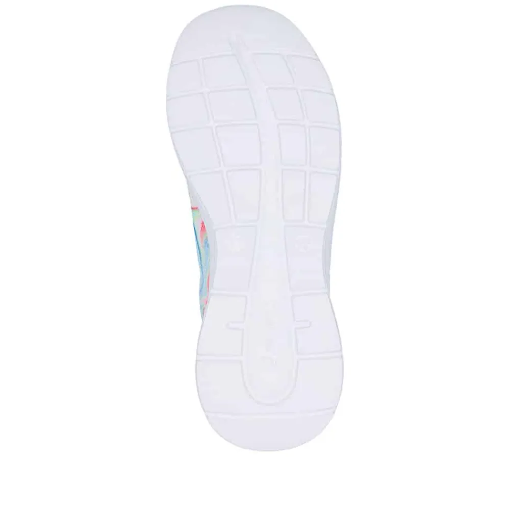 Rieker sneakers til dame i en flot farvekombination. Elegant sneakers med farverige detaljer der giver skoen ekstra strejf af stil. Skoen har snørebånd foran som gør det nemt at justere pasformen, og indvendigt mødes du af en blød og udtagelig Rieker-Soft så. Den lette og fleksible ydersål er designet med Rieker-Light+ og stødabsorbering for god komfort hele dagen.