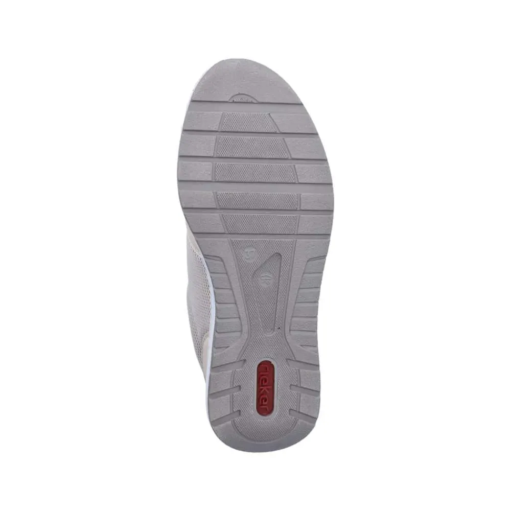 Rieker sneakers til dame i beige. Flotte sneakers med funktionelle detaljer, der gør dem ideelle til hverdagsbrug. Skoen har både snørebånd og en funktionel lynlås, som gør det nemt at komme i og af skoen. Indvendigt finder du en blød og udtagelig sål, mens ekstra bredde (H) giver god rummelighed og komfort til foden hele dagen. Den mønstrede ydersål giver øget stødabsorbering og skridsikkerhed dagen igennem.
