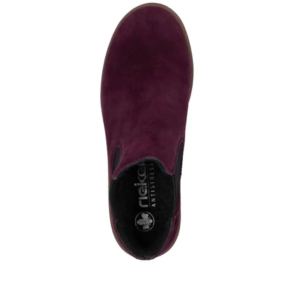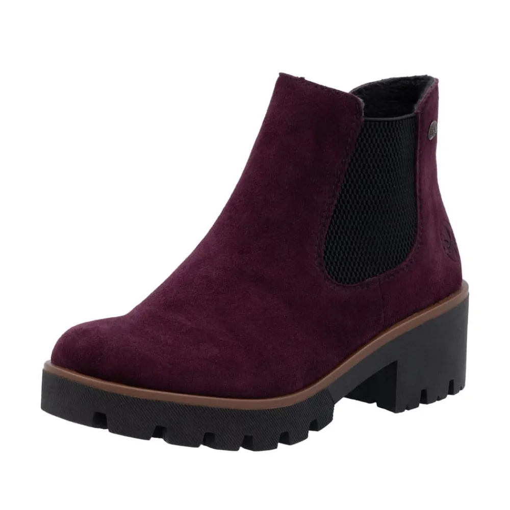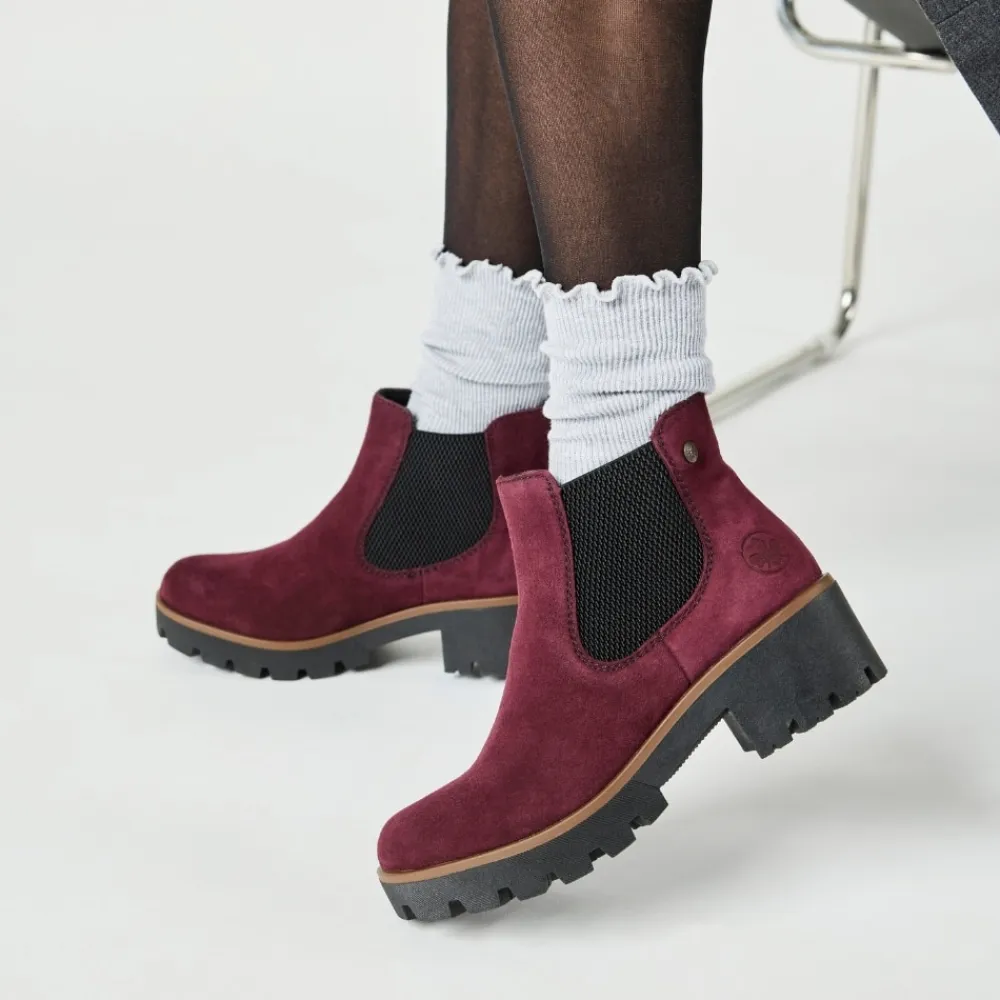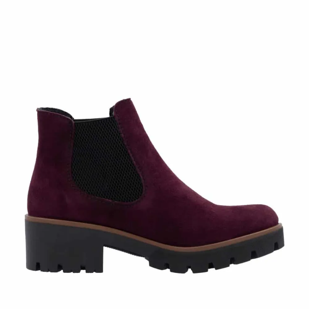 Rieker støvle til dame i bordeaux. Moderne chelseastøvle til dame i en smuk bordeaux farve med en elegant ruskindsoverdel, der tilfører et stilfuldt udtryk. Støvlen har elastik i begge sider, som sikrer en behagelig pasform og gør den nem at tage af og på. Indvendigt finder du en blød indersål og en let foring, der giver komfort hele dagen. Den solide blokhæl på 5 cm tilføjer et elegant løft, uden at gå på kompromis med komforten. Ydersålen har stødabsorberende egenskaber og et mønster, der giver øget støtte og skridsikkerhed.