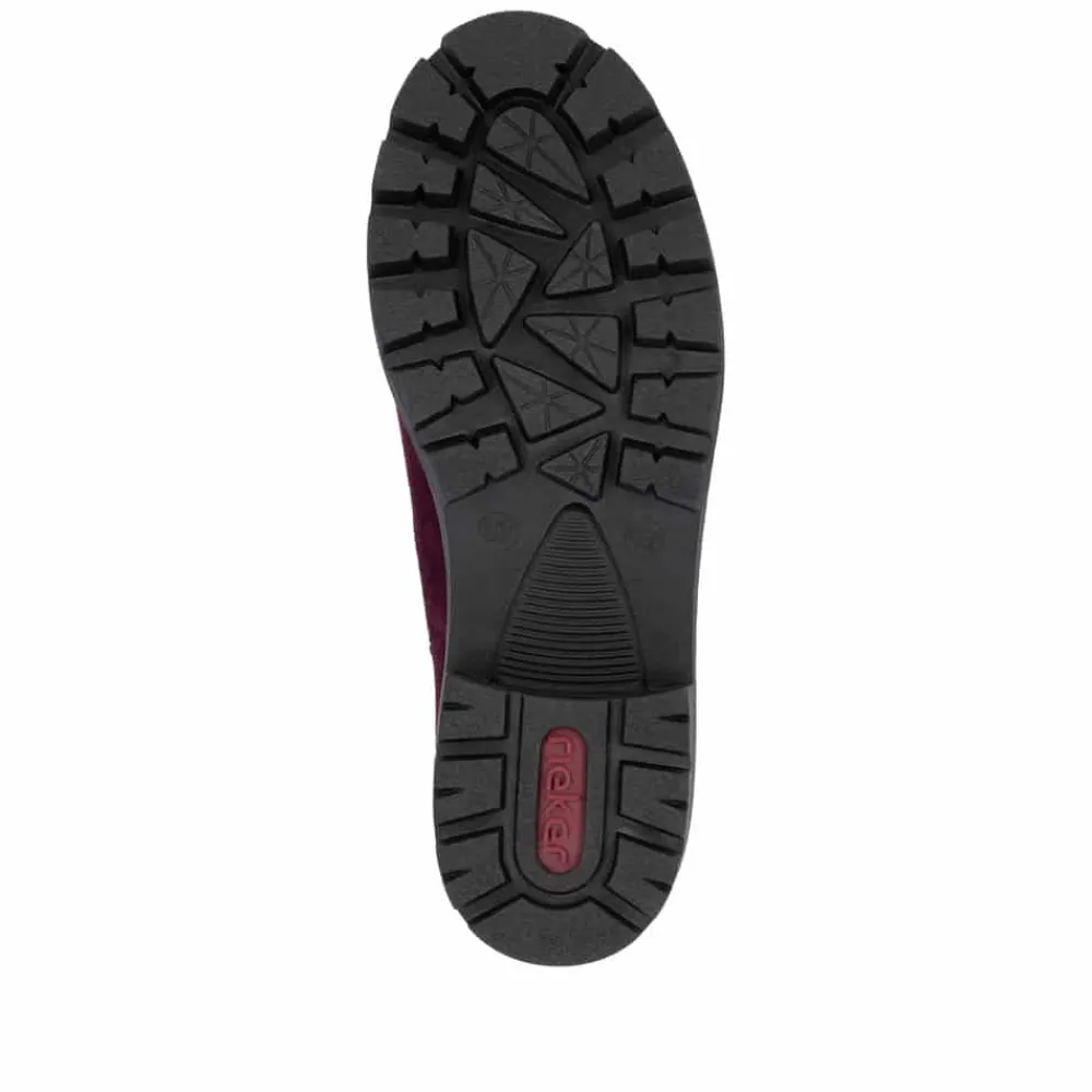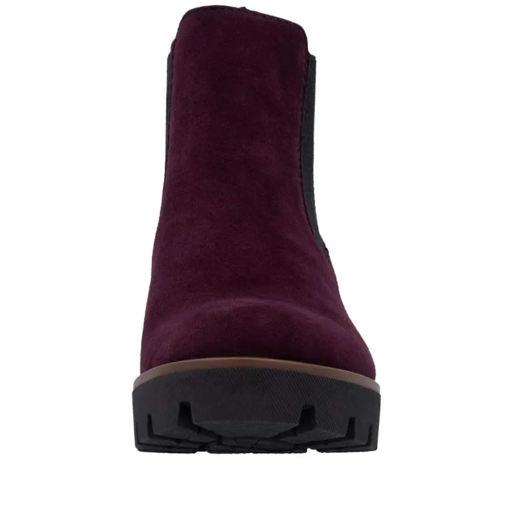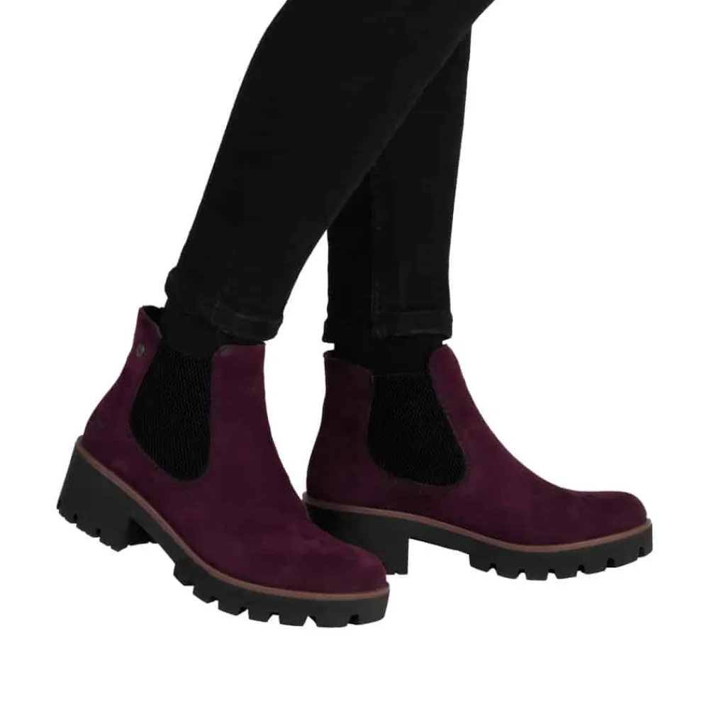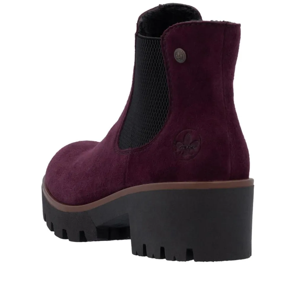Rieker støvle til dame i bordeaux. Moderne chelseastøvle til dame i en smuk bordeaux farve med en elegant ruskindsoverdel, der tilfører et stilfuldt udtryk. Støvlen har elastik i begge sider, som sikrer en behagelig pasform og gør den nem at tage af og på. Indvendigt finder du en blød indersål og en let foring, der giver komfort hele dagen. Den solide blokhæl på 5 cm tilføjer et elegant løft, uden at gå på kompromis med komforten. Ydersålen har stødabsorberende egenskaber og et mønster, der giver øget støtte og skridsikkerhed.